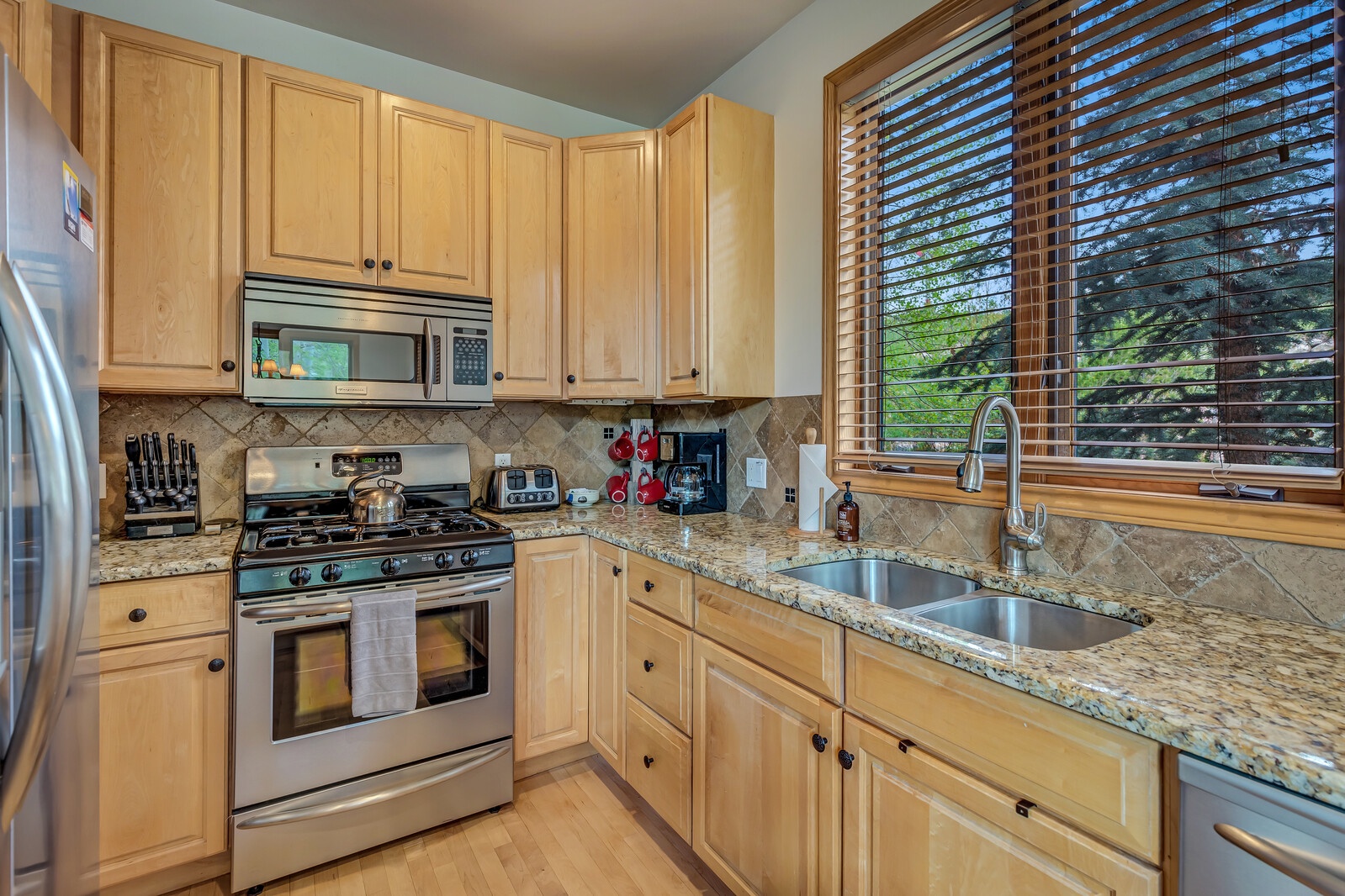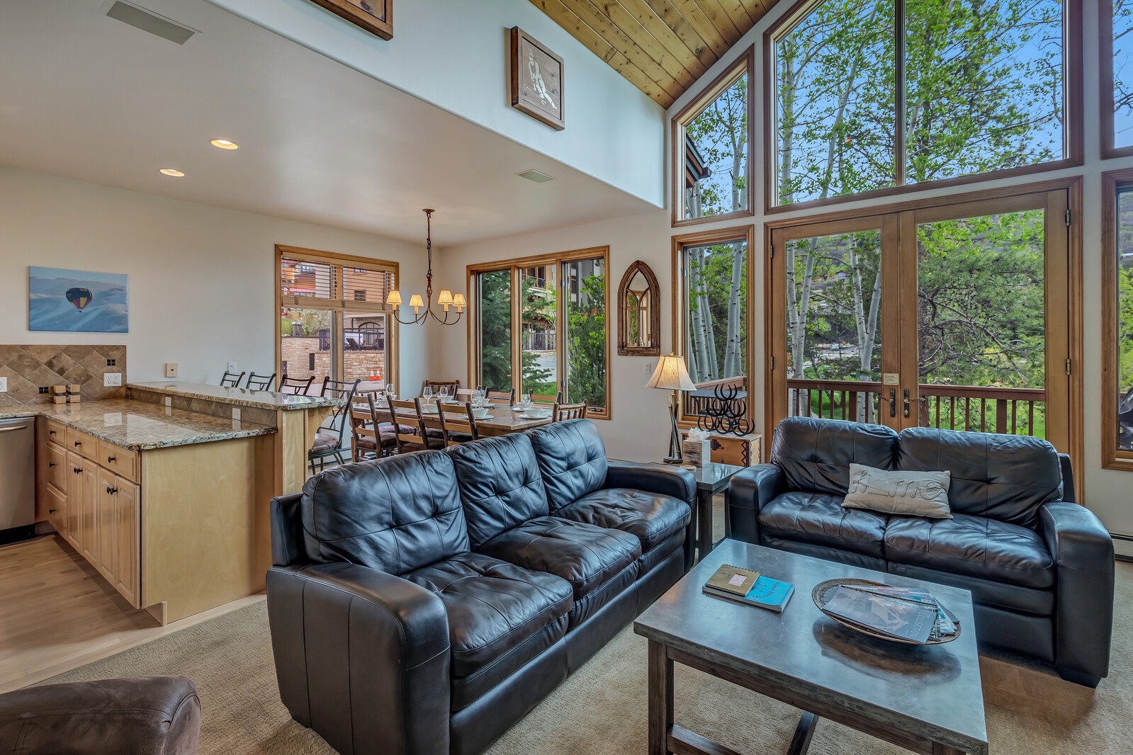 Step inside this tastefully furnished townhome and be greeted by a blend of modern style and mountain charm. The fully equipped, updated kitchen features granite countertops and a spacious open floor plan, ideal for entertaining. Vaulted ceilings and large windows fill the space with natural light, creating a warm and inviting atmosphere. Each of the 3 bedrooms offers comfort and privacy, including en-suite bathrooms for added luxury. Relax in the cozy living room or enjoy a family meal on the deck overlooking a serene aspen grove.