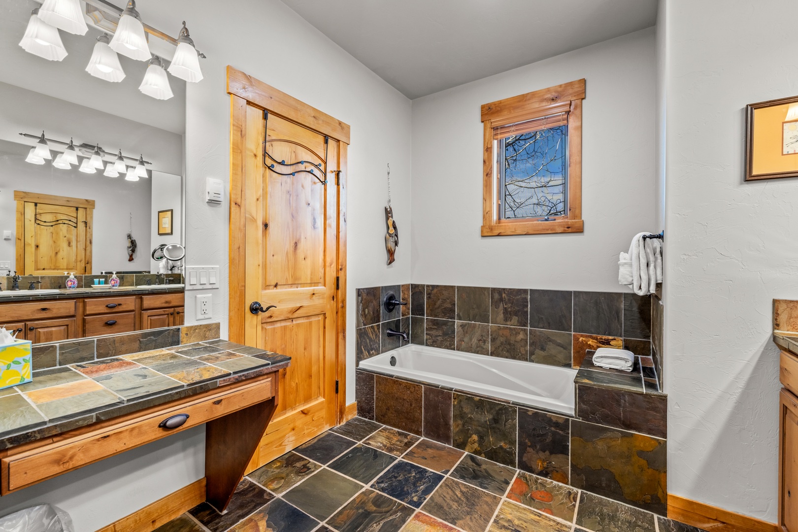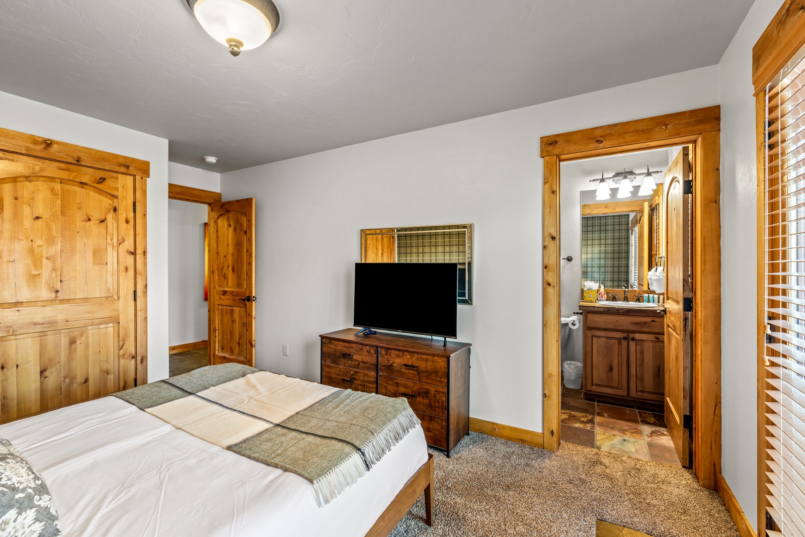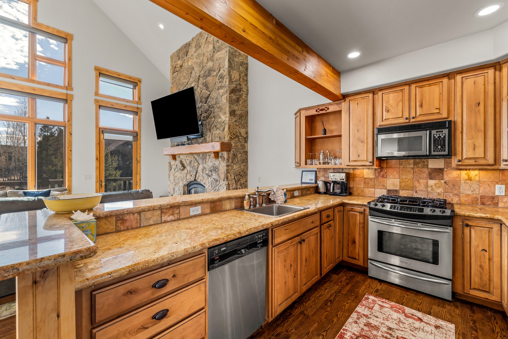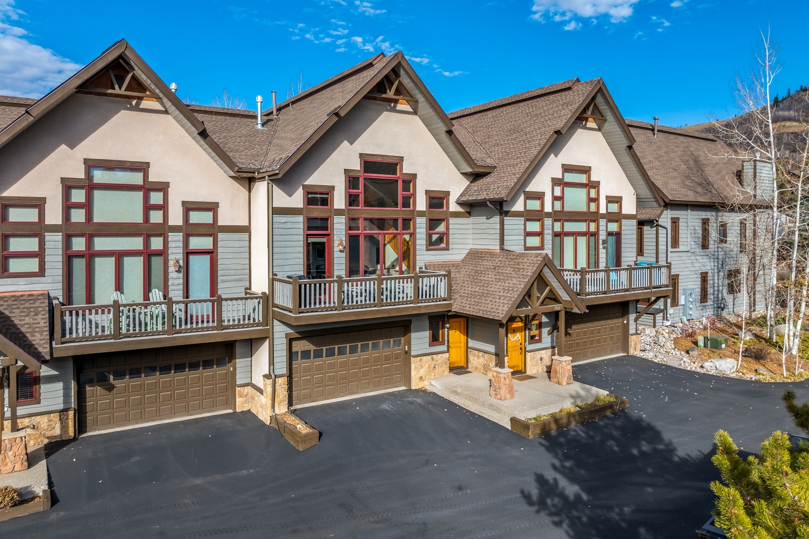 Relaxation awaits in the living room, featuring vaulted ceilings, a floor-to-ceiling fireplace, and expansive windows framing breathtaking mountain views. This floor also includes a serene bedroom with an en suite bathroom which includes a stone shower and luxurious soaking tub. Ascend to the top floor for the private fourth bedroom-a tranquil haven with 2 full beds, en suite bath, and an exquisite stone shower.