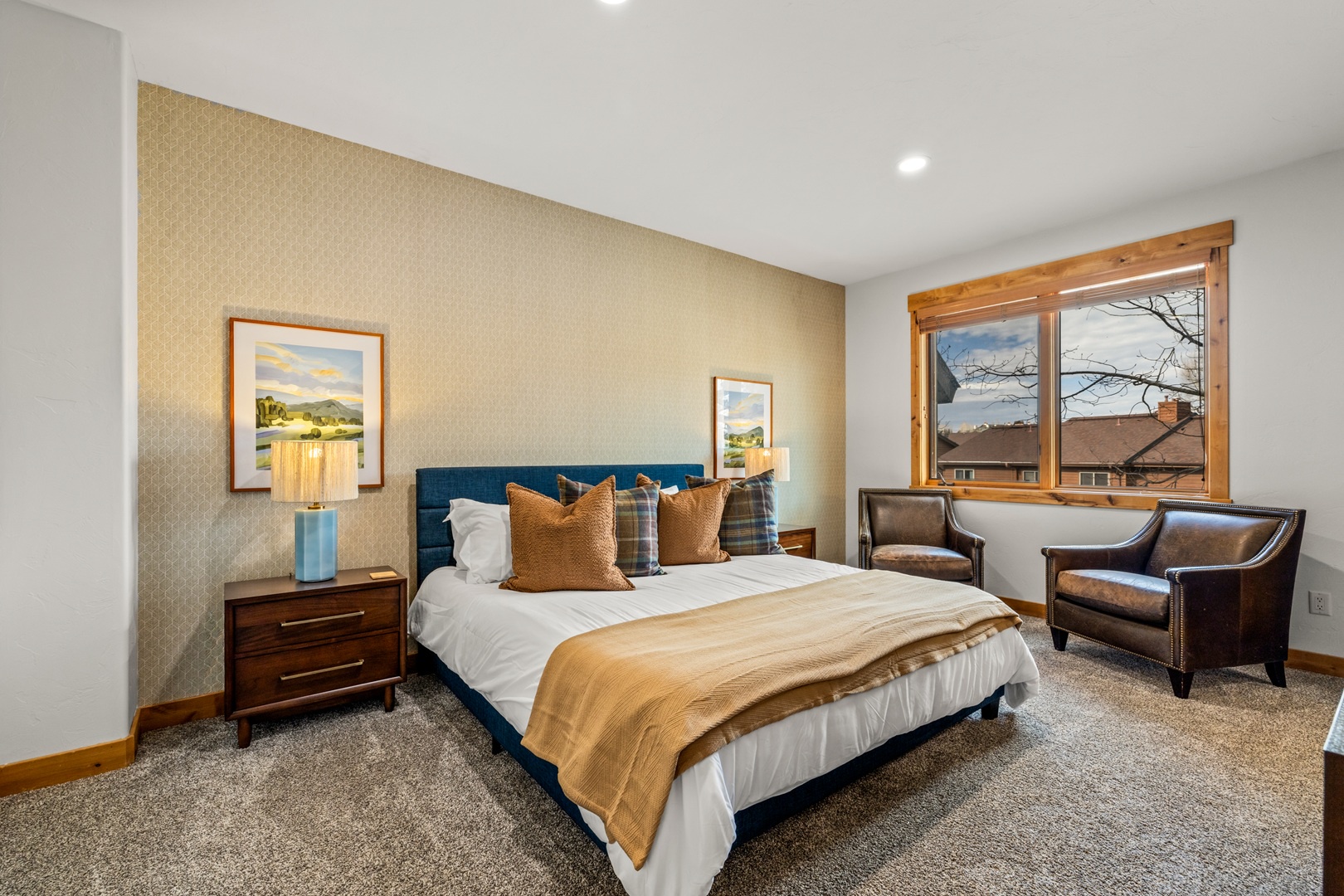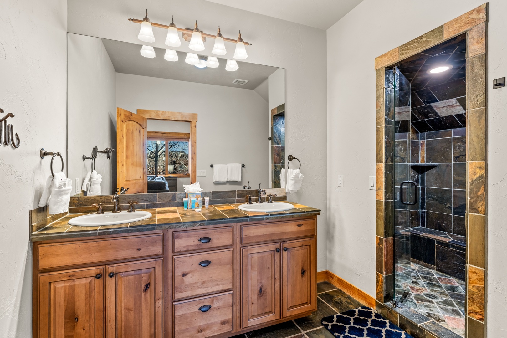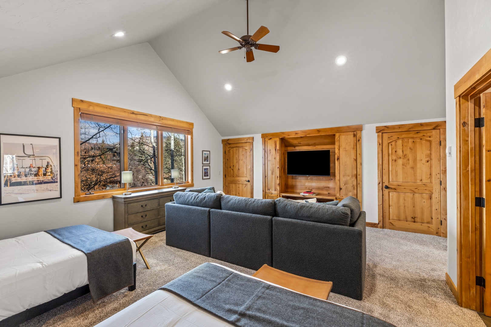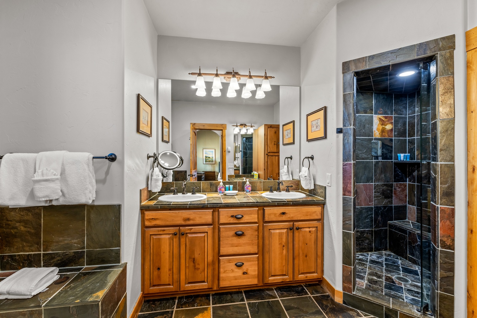 Relaxation awaits in the living room, featuring vaulted ceilings, a floor-to-ceiling fireplace, and expansive windows framing breathtaking mountain views. This floor also includes a serene bedroom with an en suite bathroom which includes a stone shower and luxurious soaking tub. Ascend to the top floor for the private fourth bedroom-a tranquil haven with 2 full beds, en suite bath, and an exquisite stone shower.