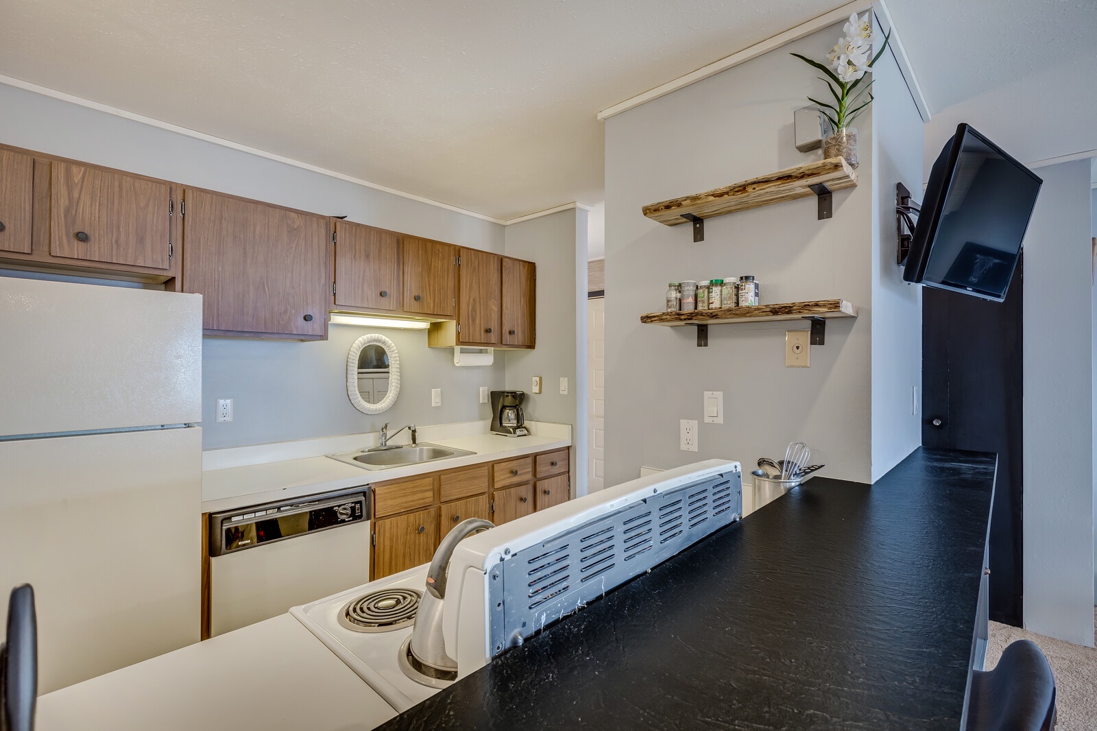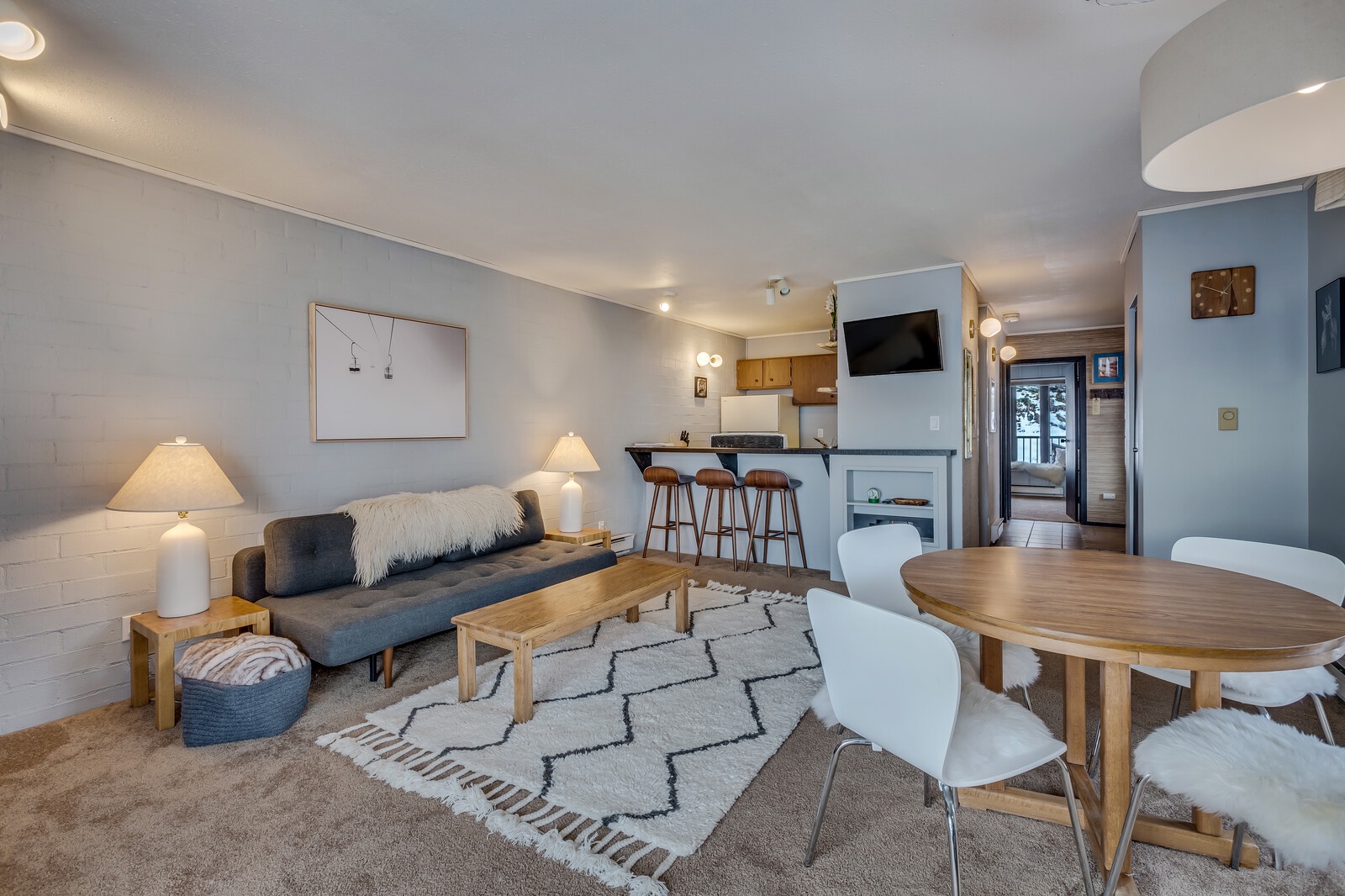 Step into a warm and inviting space where comfort meets convenience. The bedroom features a NEW queen-size bed and a flat-screen TV, making it the perfect spot to unwind after an adventure-packed day. Down the hall, a fully stocked kitchen awaits, ready for you to whip up a hearty breakfast or a gourmet dinner. Dine at the table with breathtaking views of snowcats grooming the slopes through your window. The living room offers a cozy gas fireplace and another flat-screen TV for movie nights or catching up on your favorite shows.