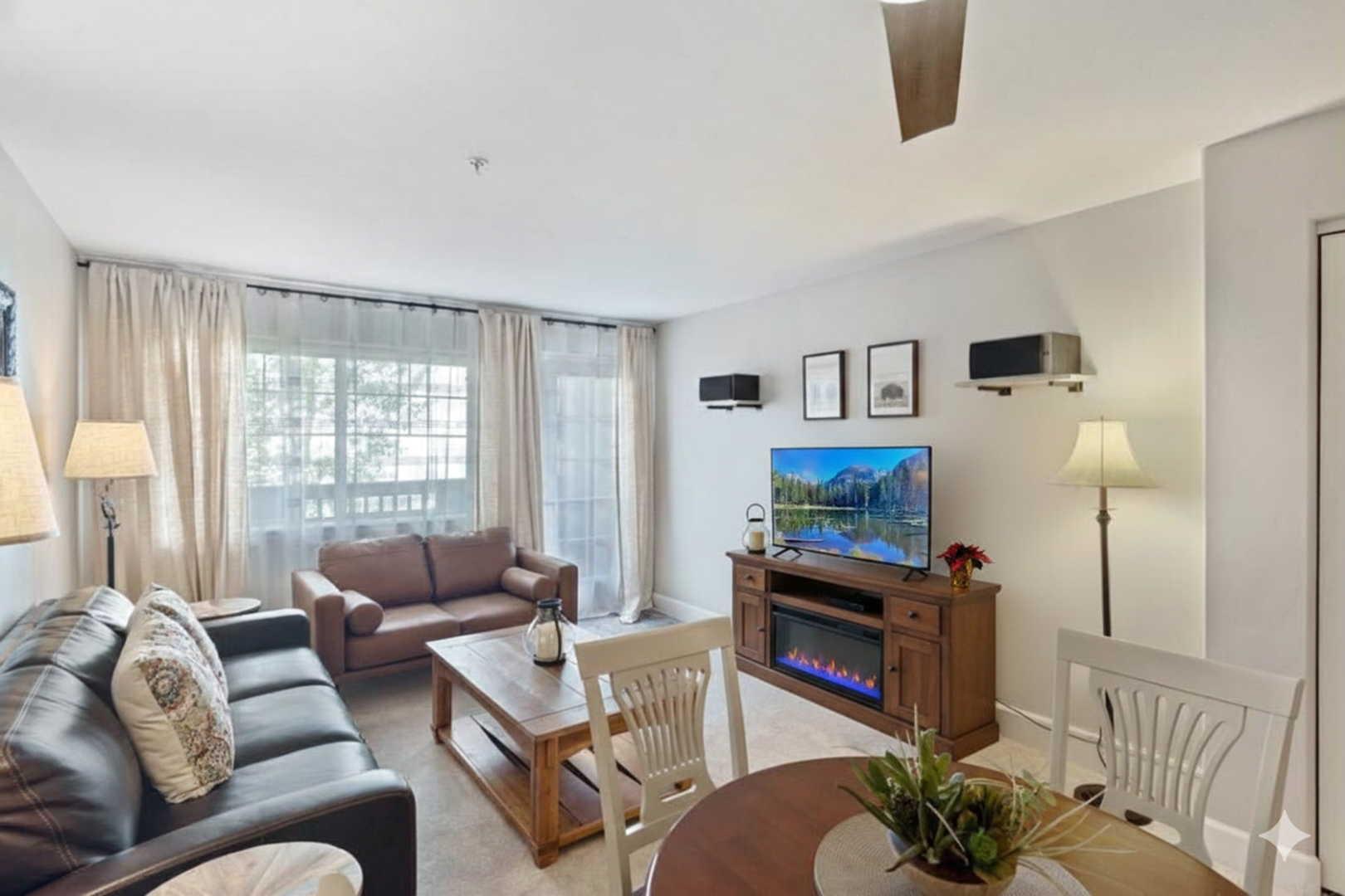 Imagine arriving to a warm and inviting space. A fully-equipped kitchen beckons you to whip up delicious meals after a day on the mountain. Relax in the comfortable living room, complete with a new 55" flat-screen TV, RGB fireplace, and a queen-size sofa bed for extra guests. The spacious bedroom boasts a king-size bed for a restful night's sleep.