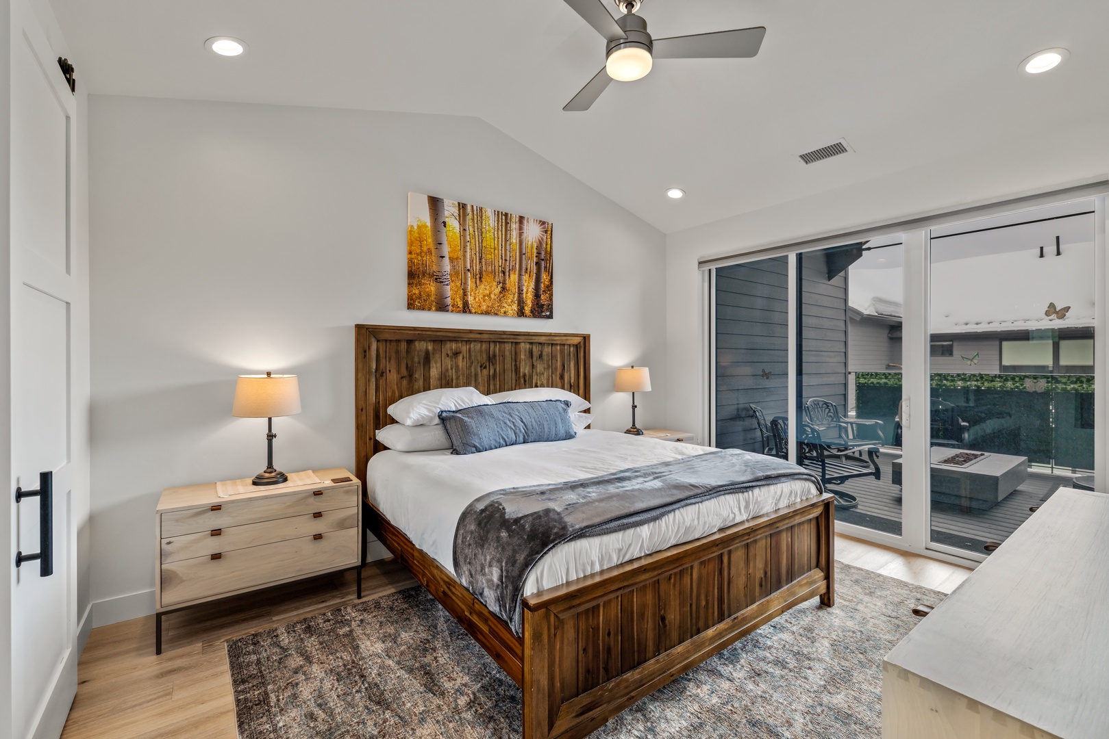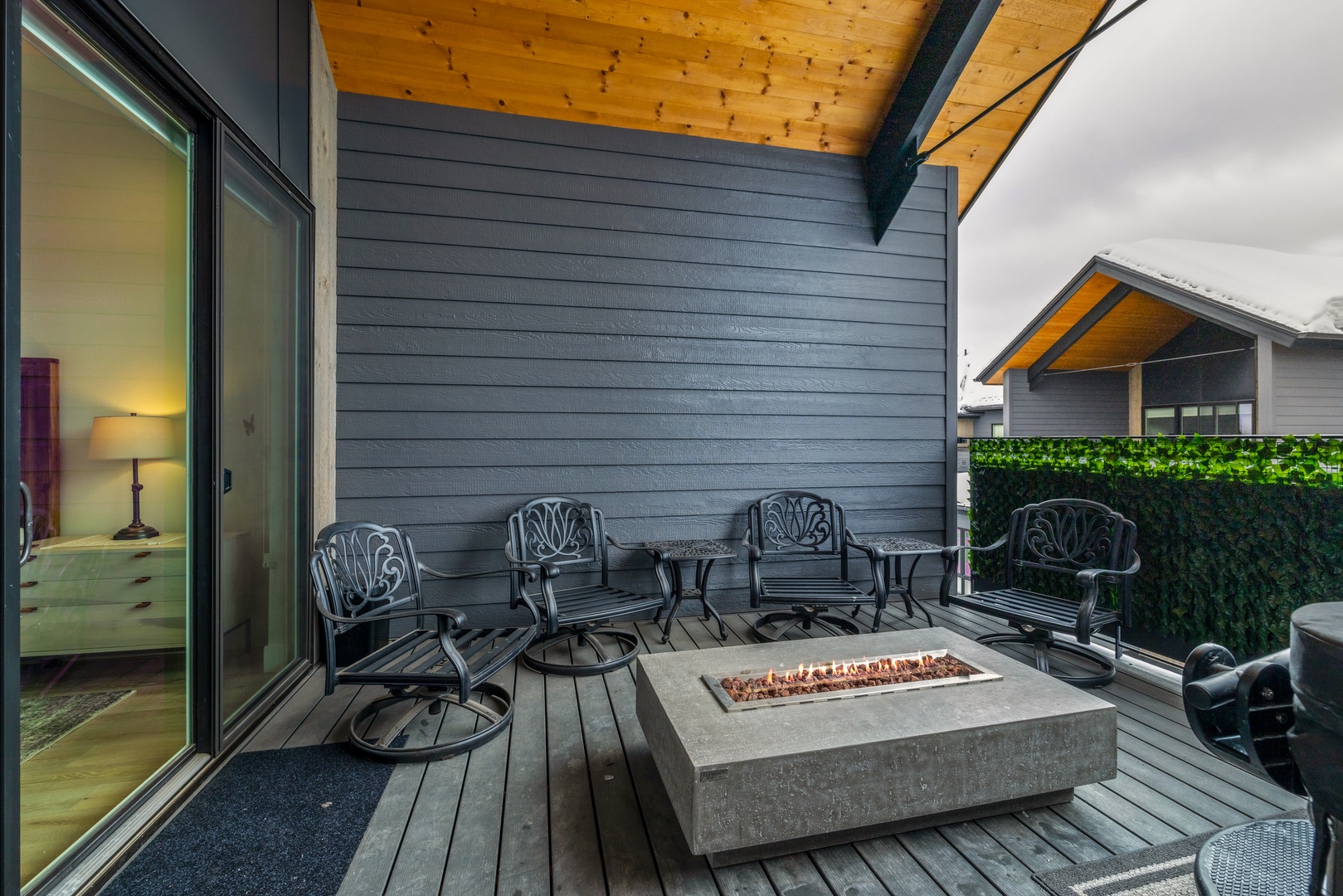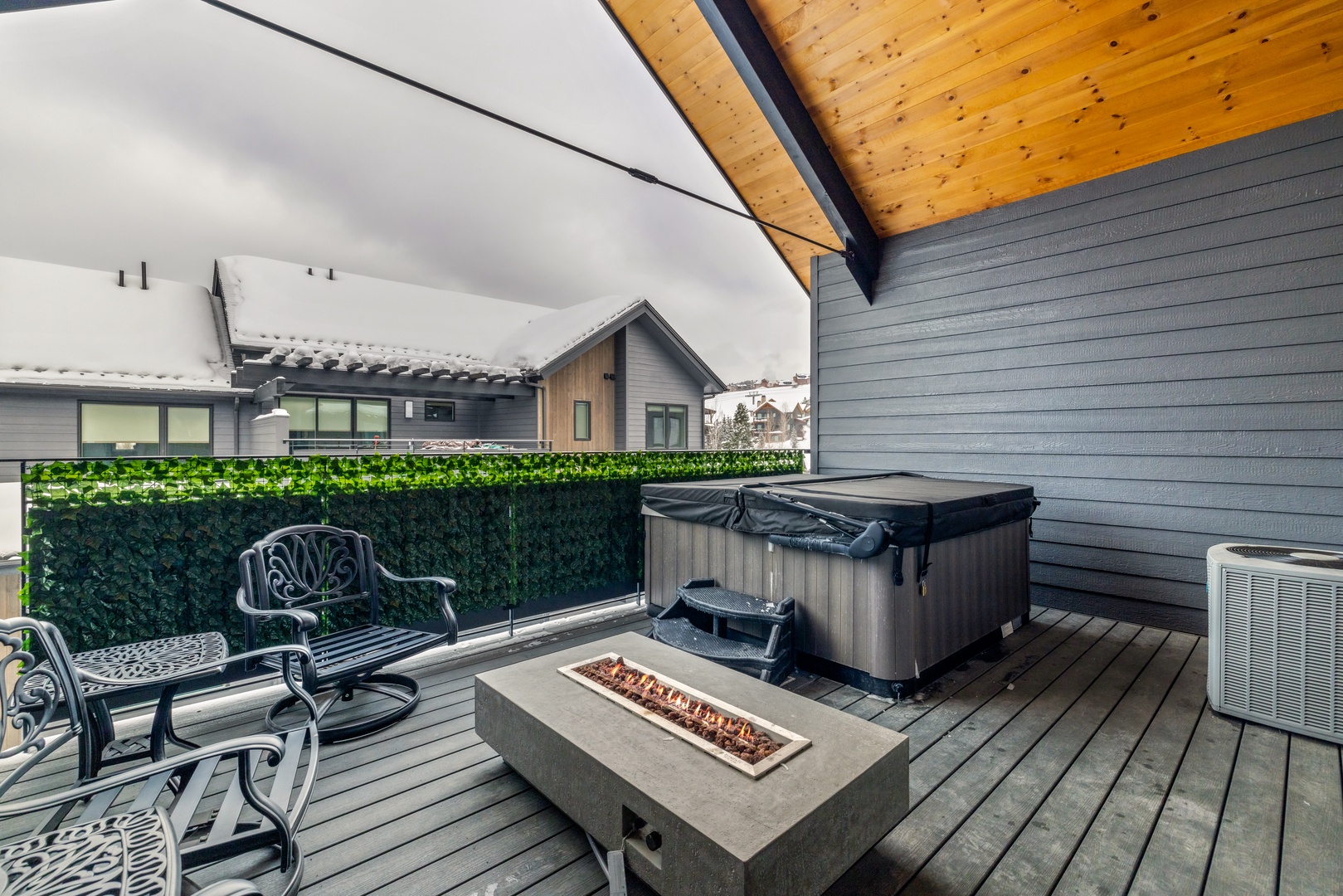 From the primary suite, step onto your private deck featuring a hot tub, outdoor fireplace, and comfortable seating — the perfect place to unwind and take in the peaceful mountain views.
