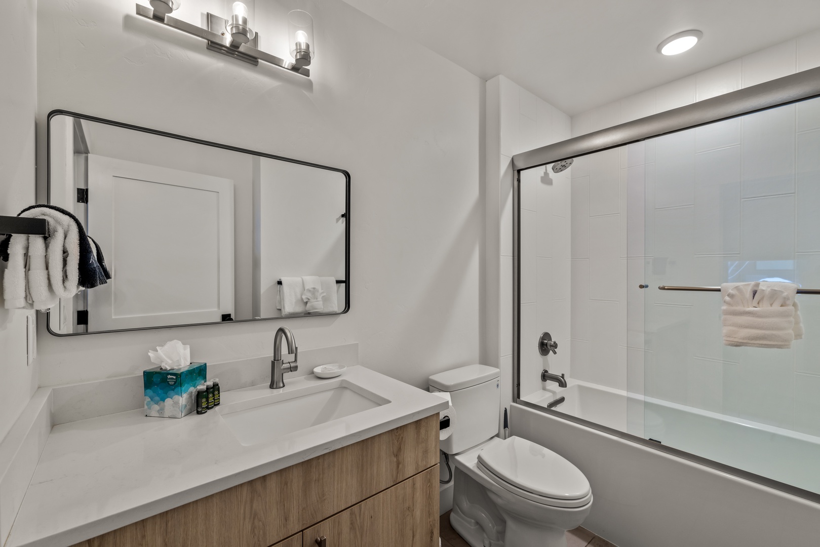 The bunk room includes two twin-over-twin bunks, with a bathroom attached featuring a tub/shower combination — an ideal retreat for kids or extra guests.