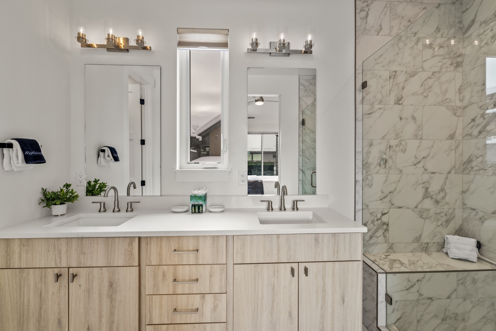 Each bedroom is thoughtfully appointed for comfort and privacy. The primary suite features a king bed, flat-screen TV, and a beautifully finished ensuite bath showcasing rich stone tilework, dual vanities, and a glass-enclosed walk-in shower.
