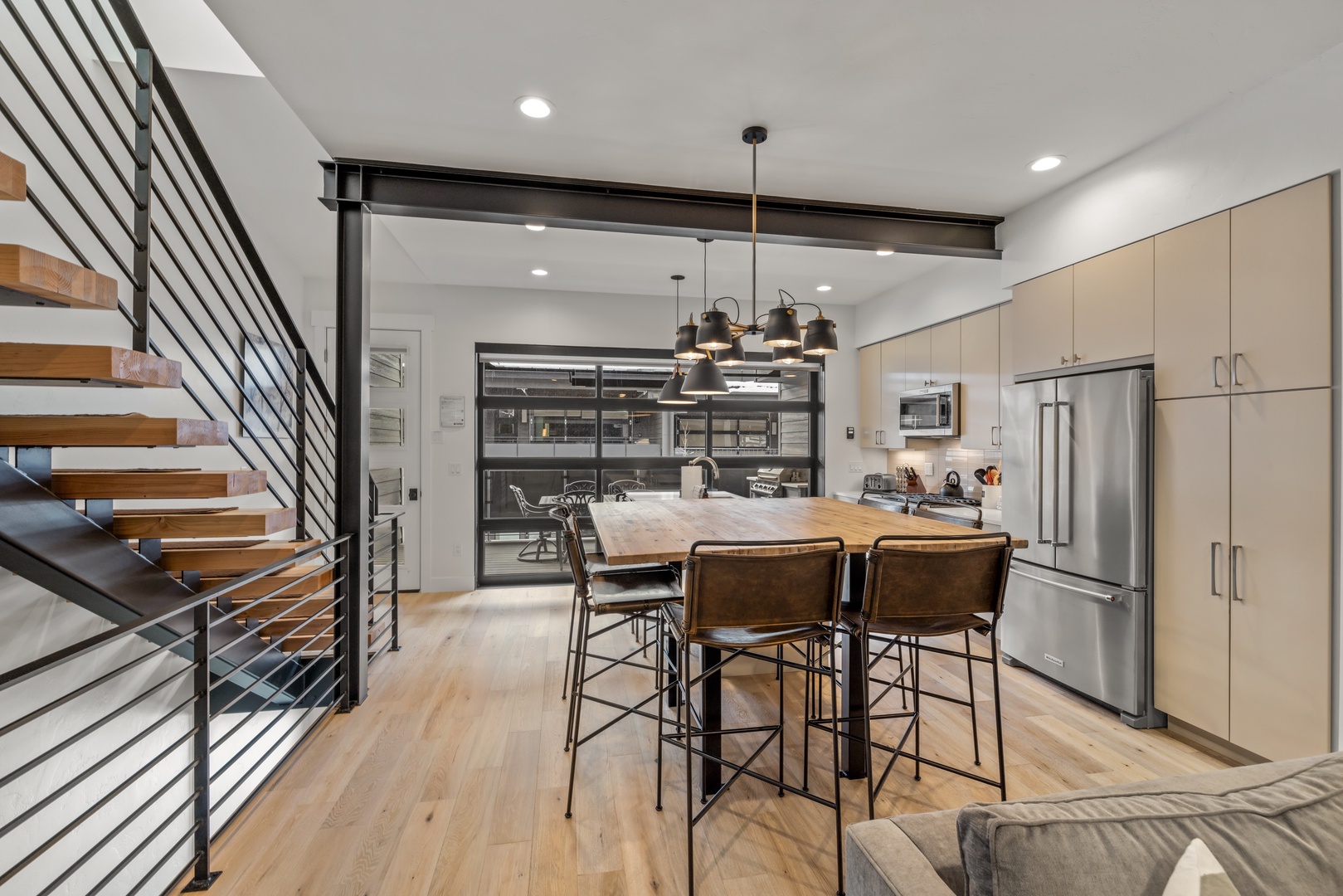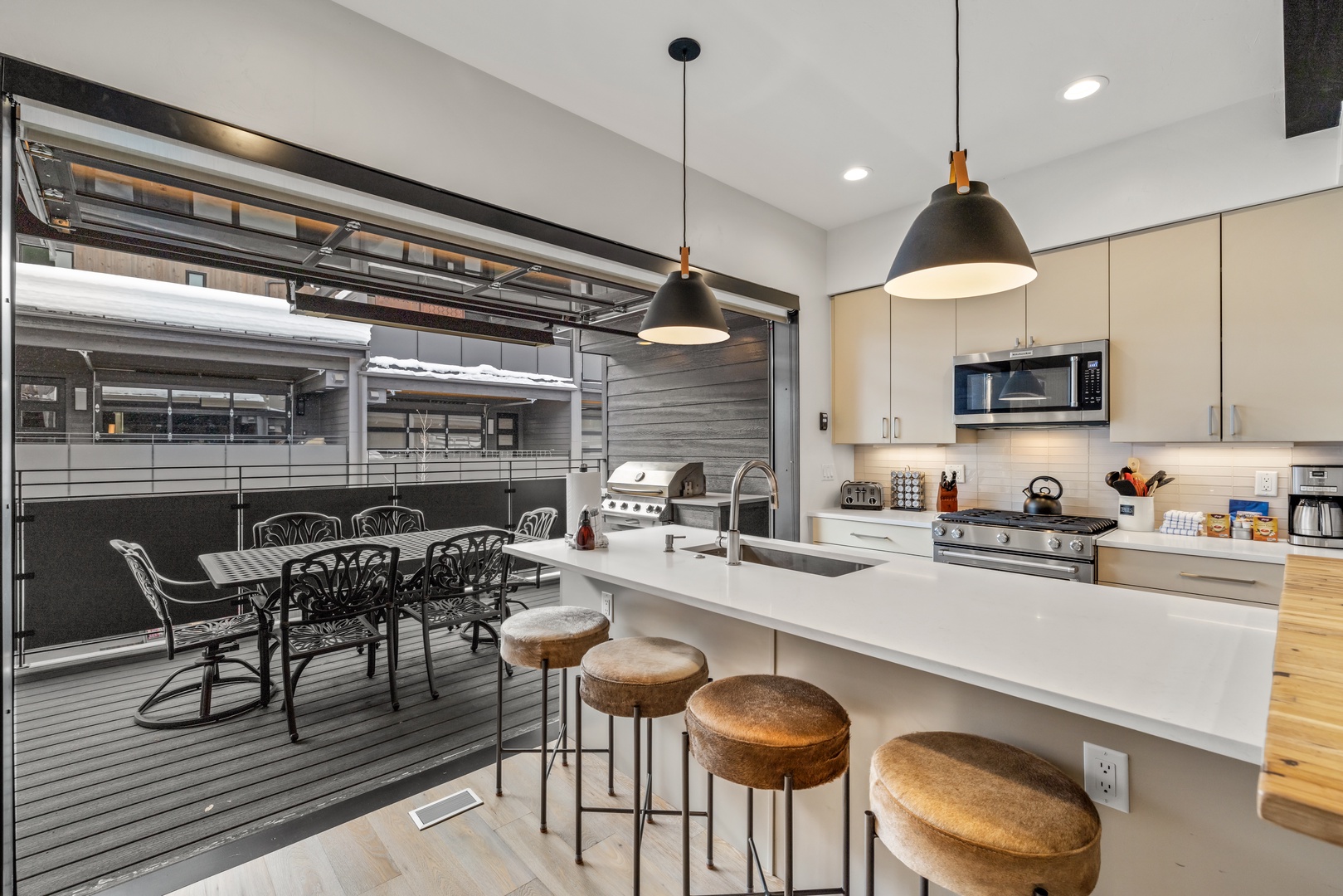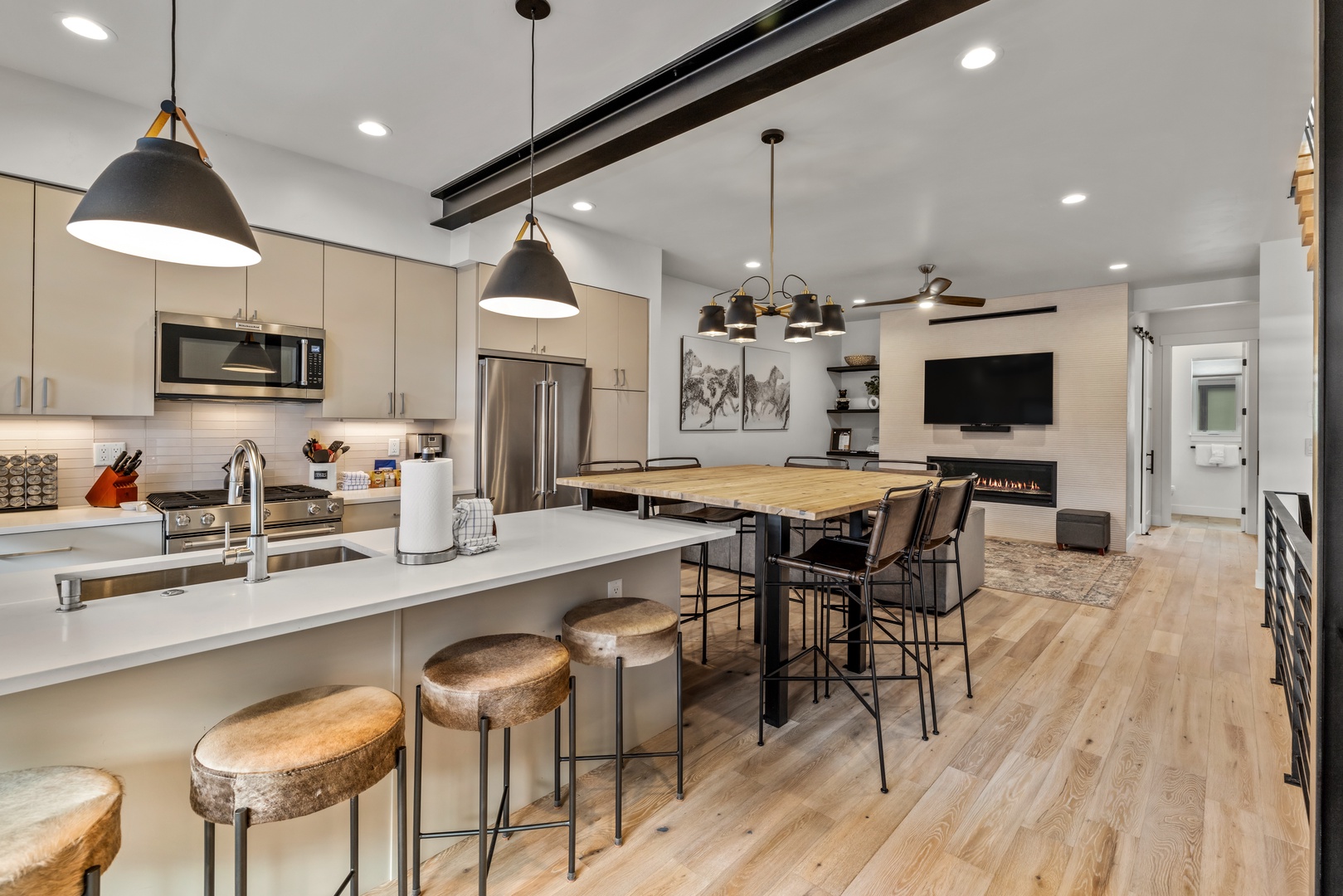 The gourmet kitchen is fully equipped with stainless steel appliances, quartz countertops, and a spacious center island with seating — perfect for gathering over coffee in the morning or sharing stories after a day on the slopes. Just beyond the kitchen, the dining area offers a comfortable yet elegant space to enjoy meals together and unwind after a day in the mountains.