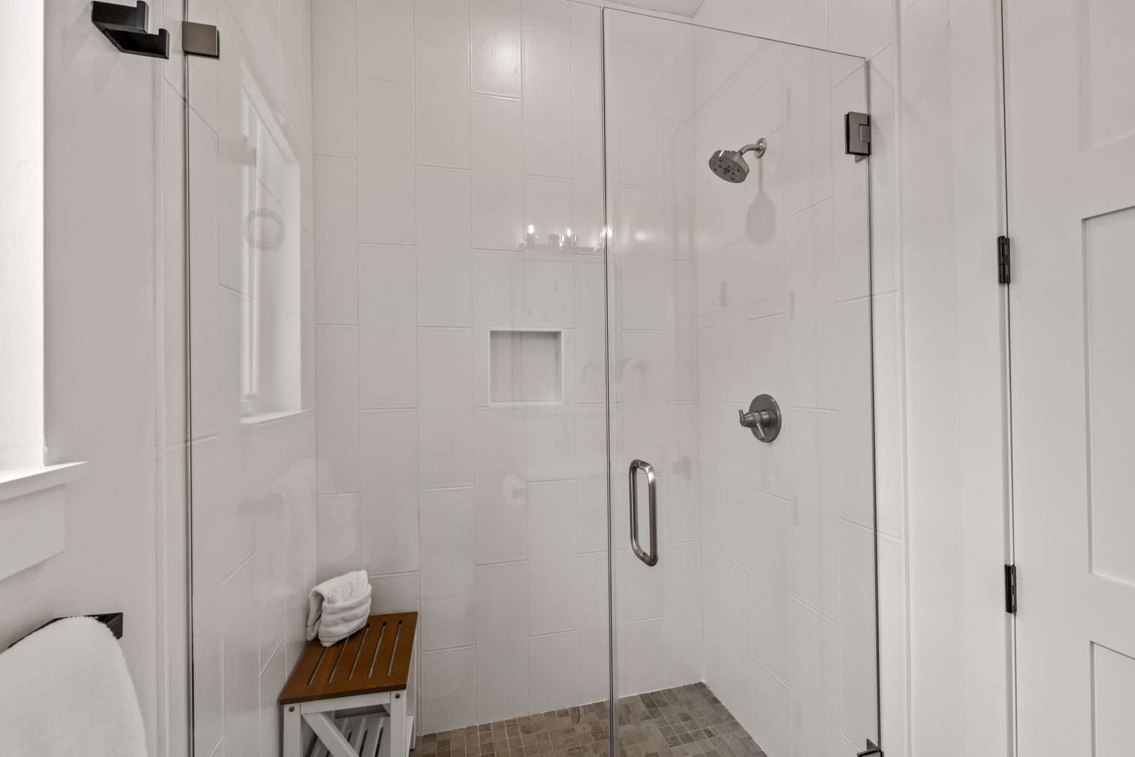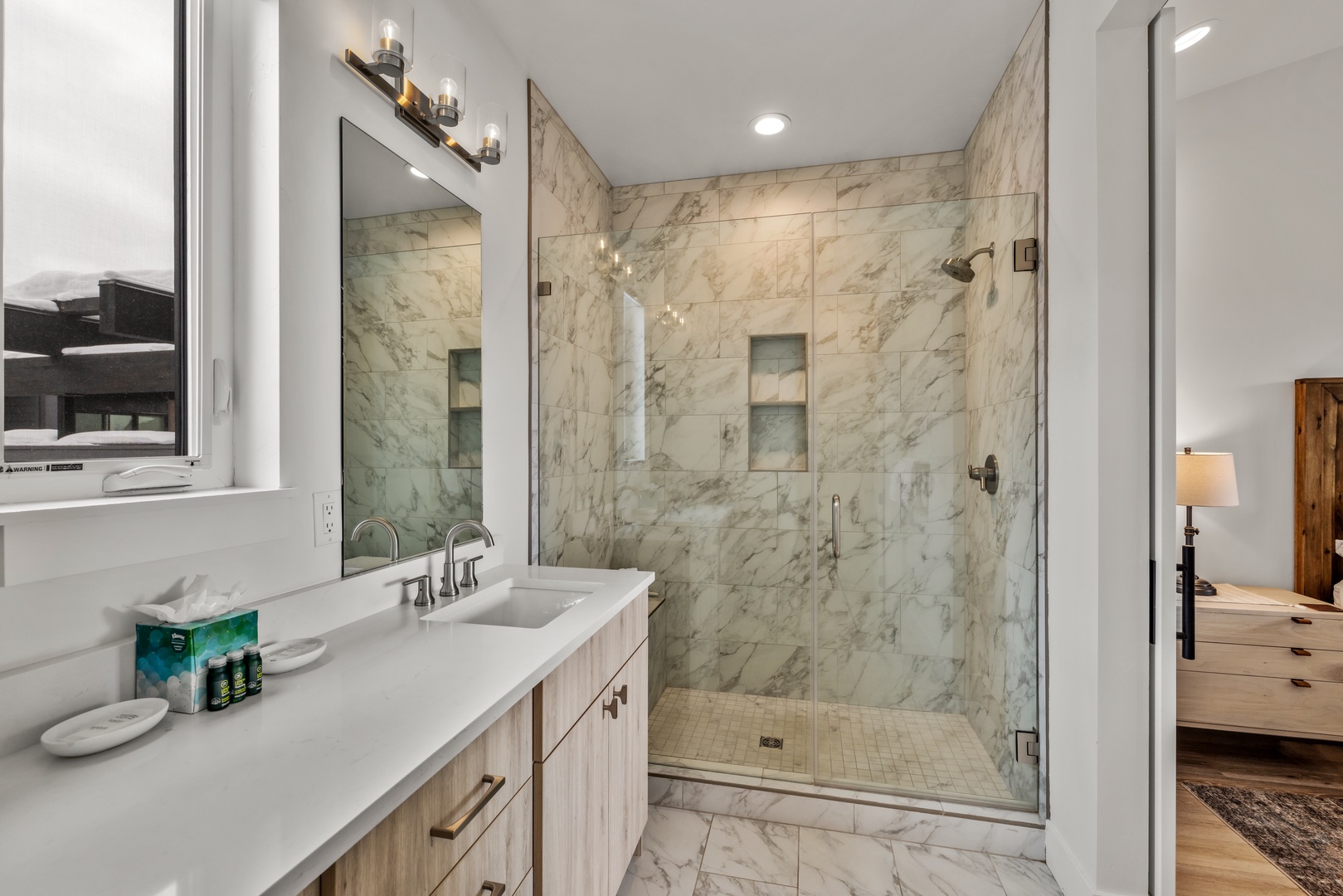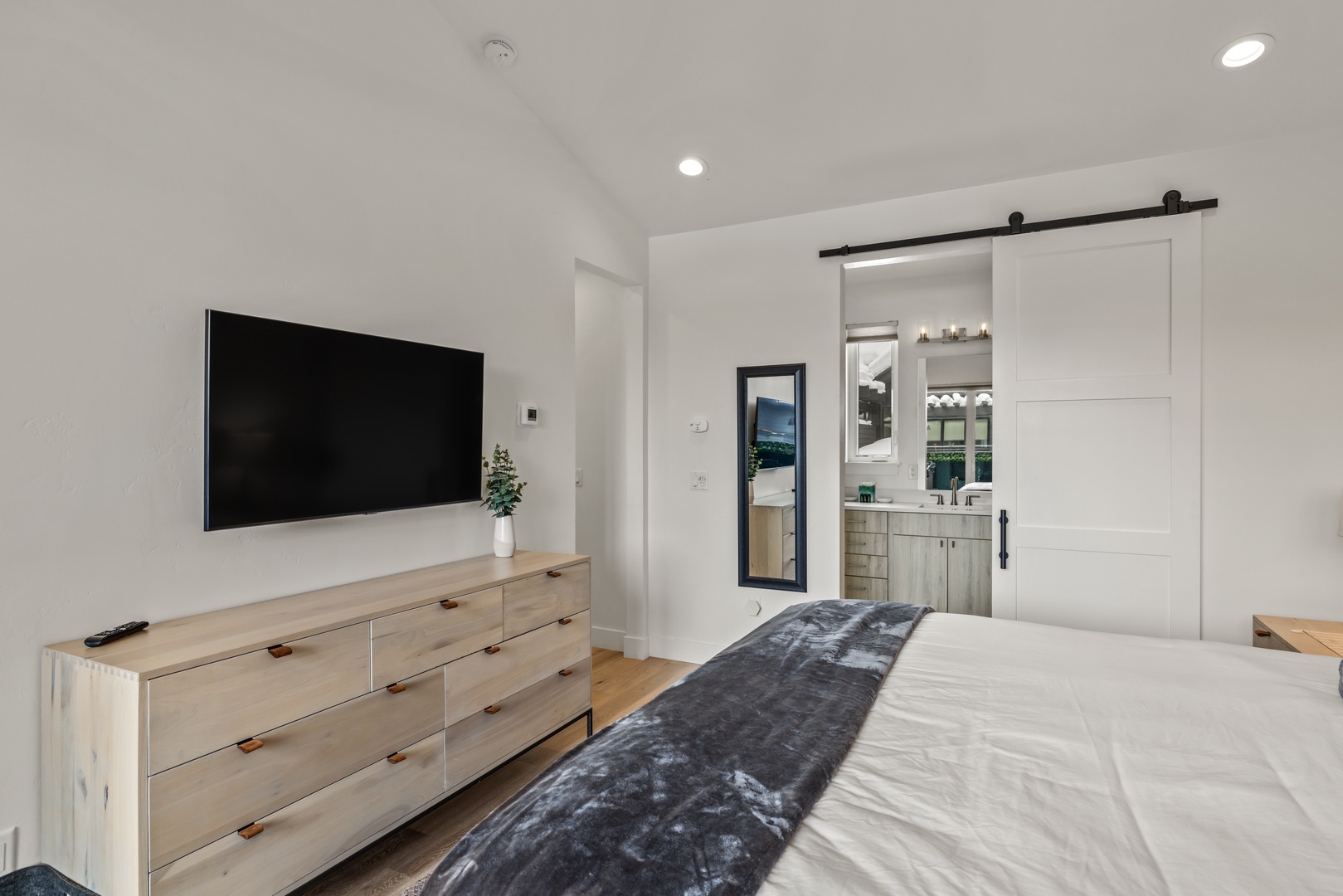 The second bedroom offers a cozy queen bed and flat-screen TV, with a beautifully finished bathroom nearby featuring a glass-enclosed walk-in shower.
