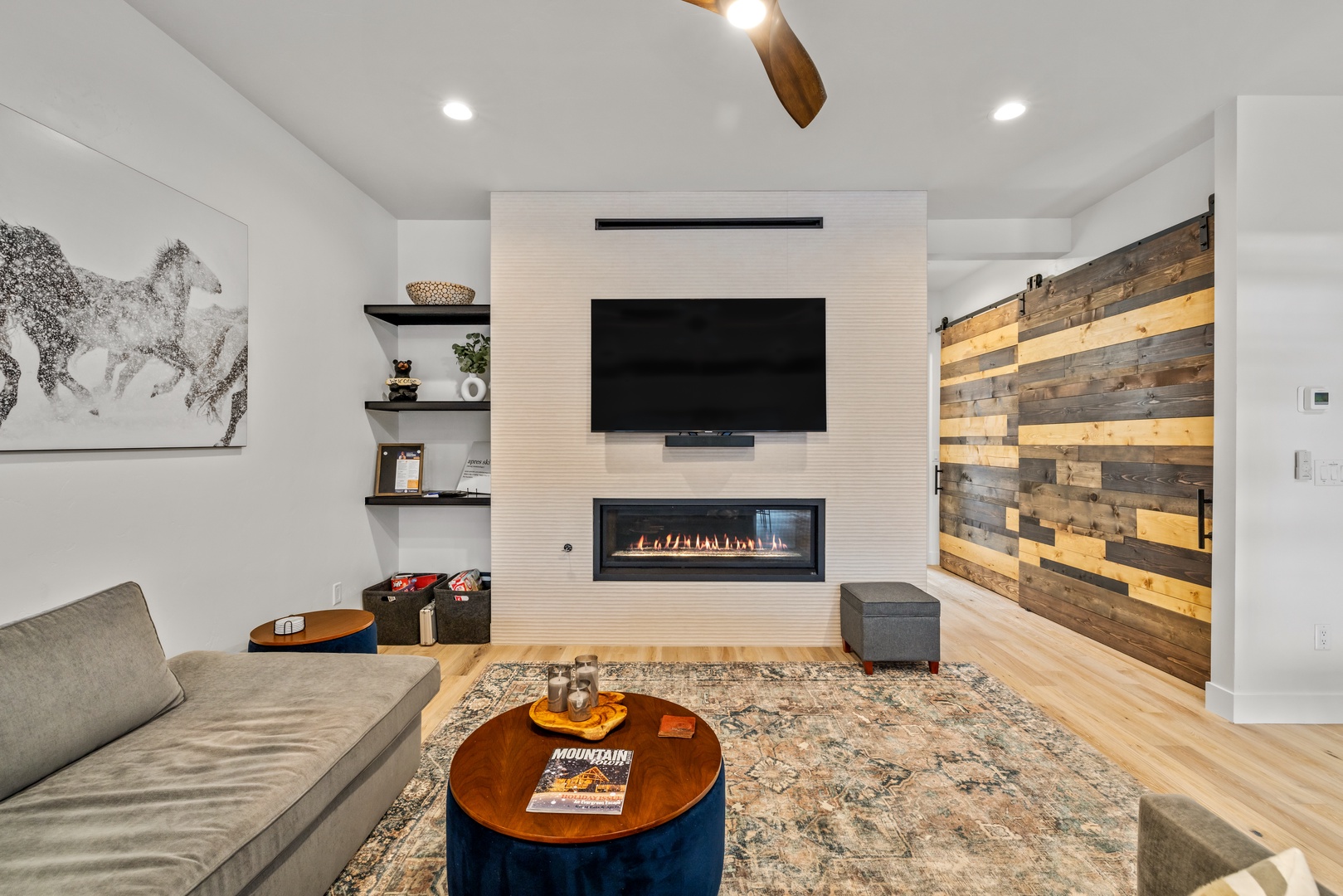Step inside to discover a bright and beautifully designed living space that blends modern sophistication with mountain comfort. The open-concept layout features luxury vinyl flooring, vaulted ceilings, and a sleek gas fireplace that anchors the main living area. Large windows frame scenic views and fill the home with natural light, creating a warm and inviting atmosphere year-round.