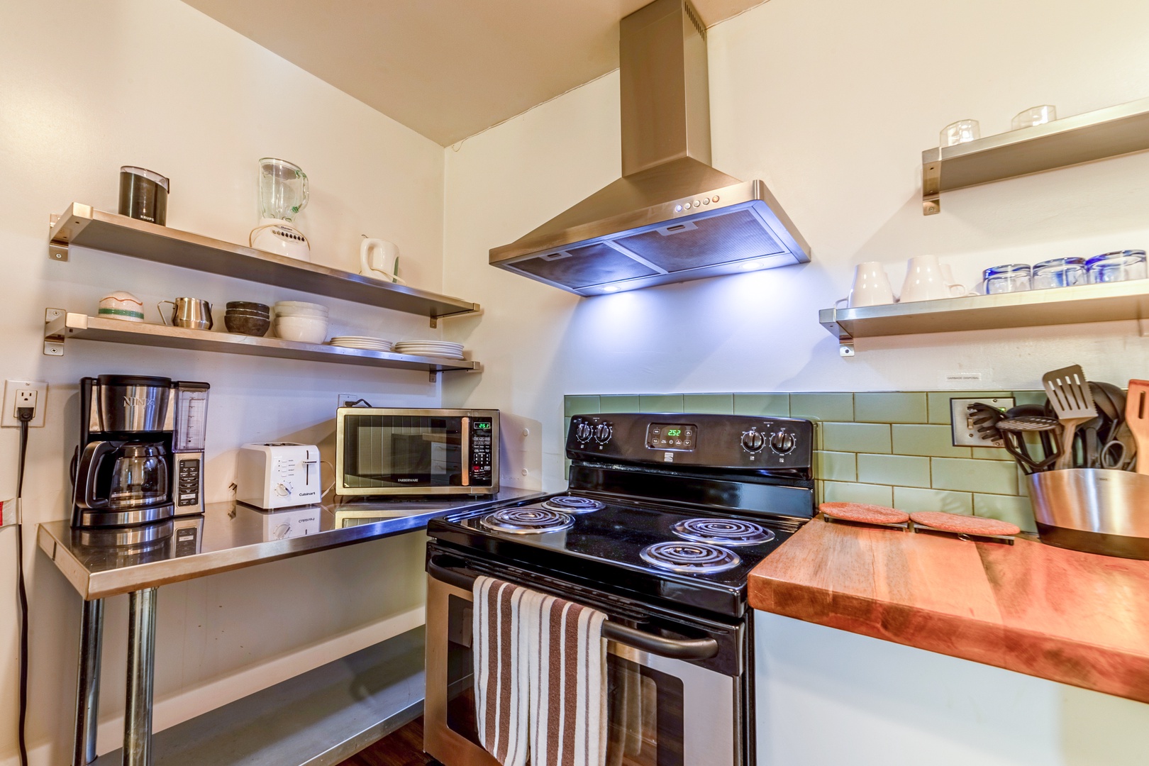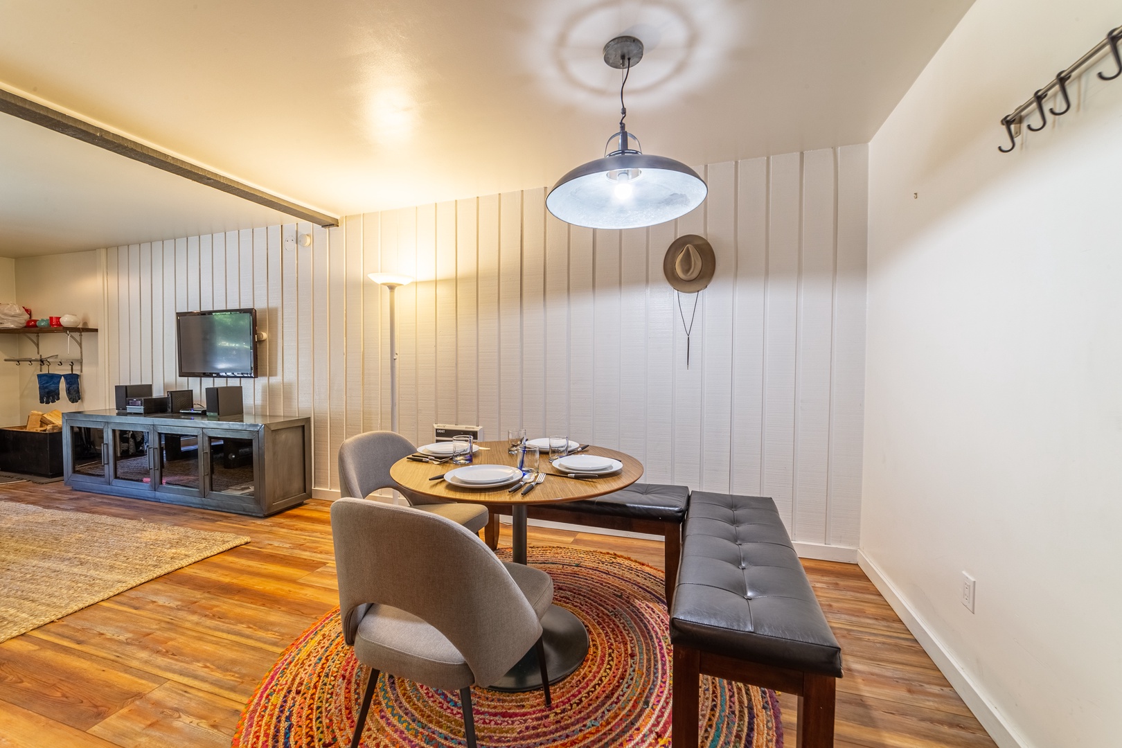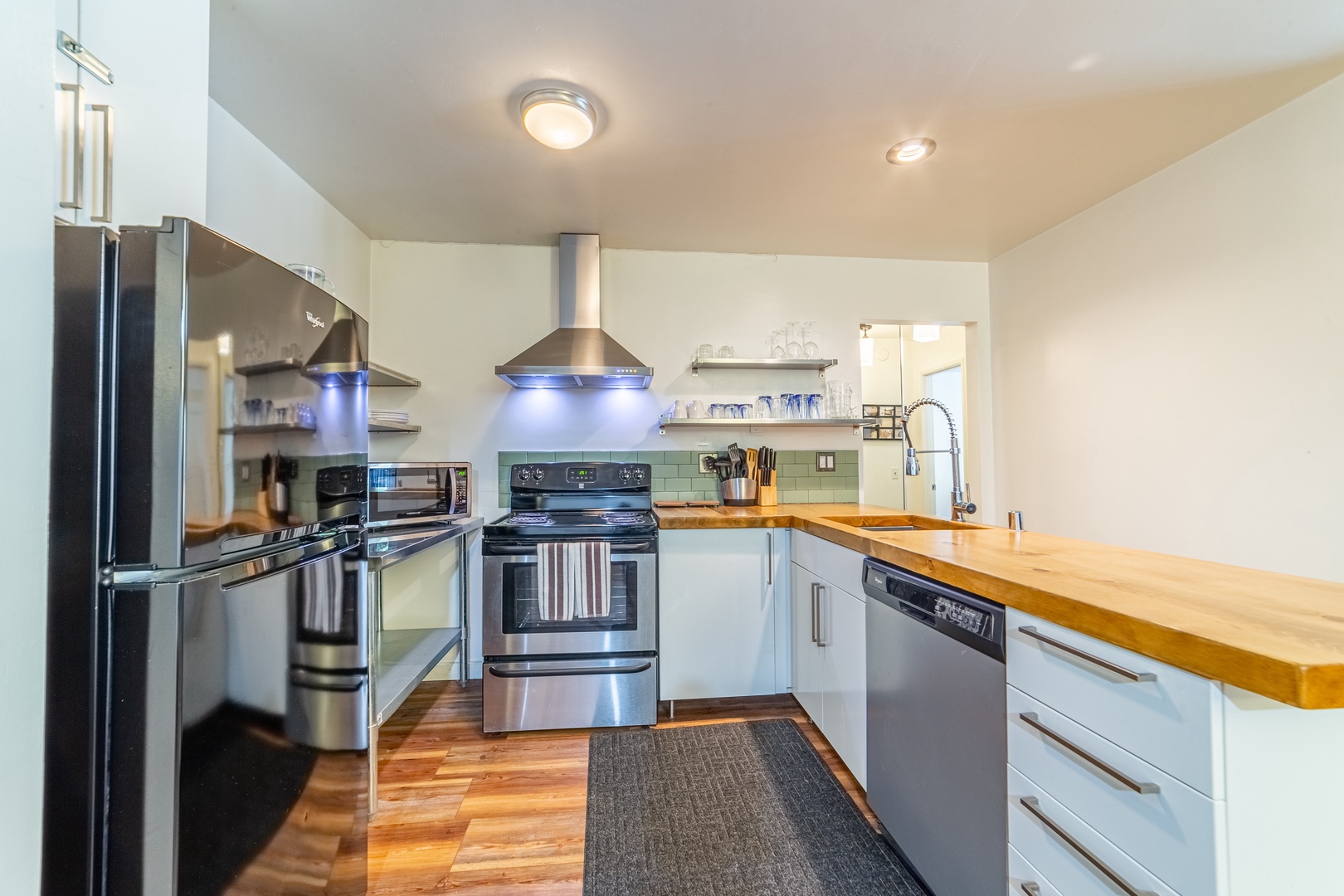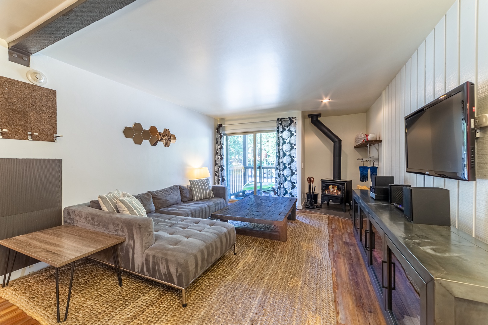 Inside Chamonix, you'll find an elegant blend of modern amenities and cozy touches. The newly remodeled kitchen features open shelving, locally crafted countertops, and brand-new appliances, fully stocked for all your cooking needs. Unwind in the living room with a 42" flat-screen TV, Blu-ray player, iPod dock, and a wood-burning stove with complimentary firewood, creating the perfect ambiance for a night in. The king-sized bed in the master bedroom promises luxurious rest, and the beautifully renovated bathroom includes a rainfall shower and a floating vanity for that spa-like feel.