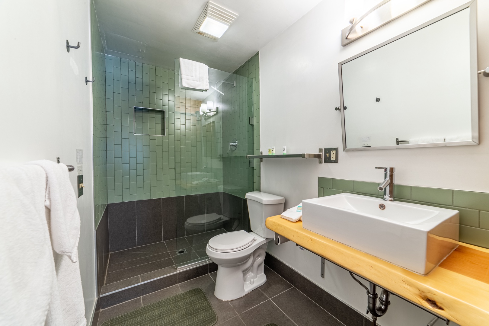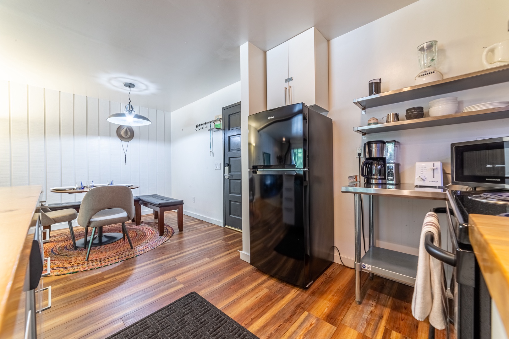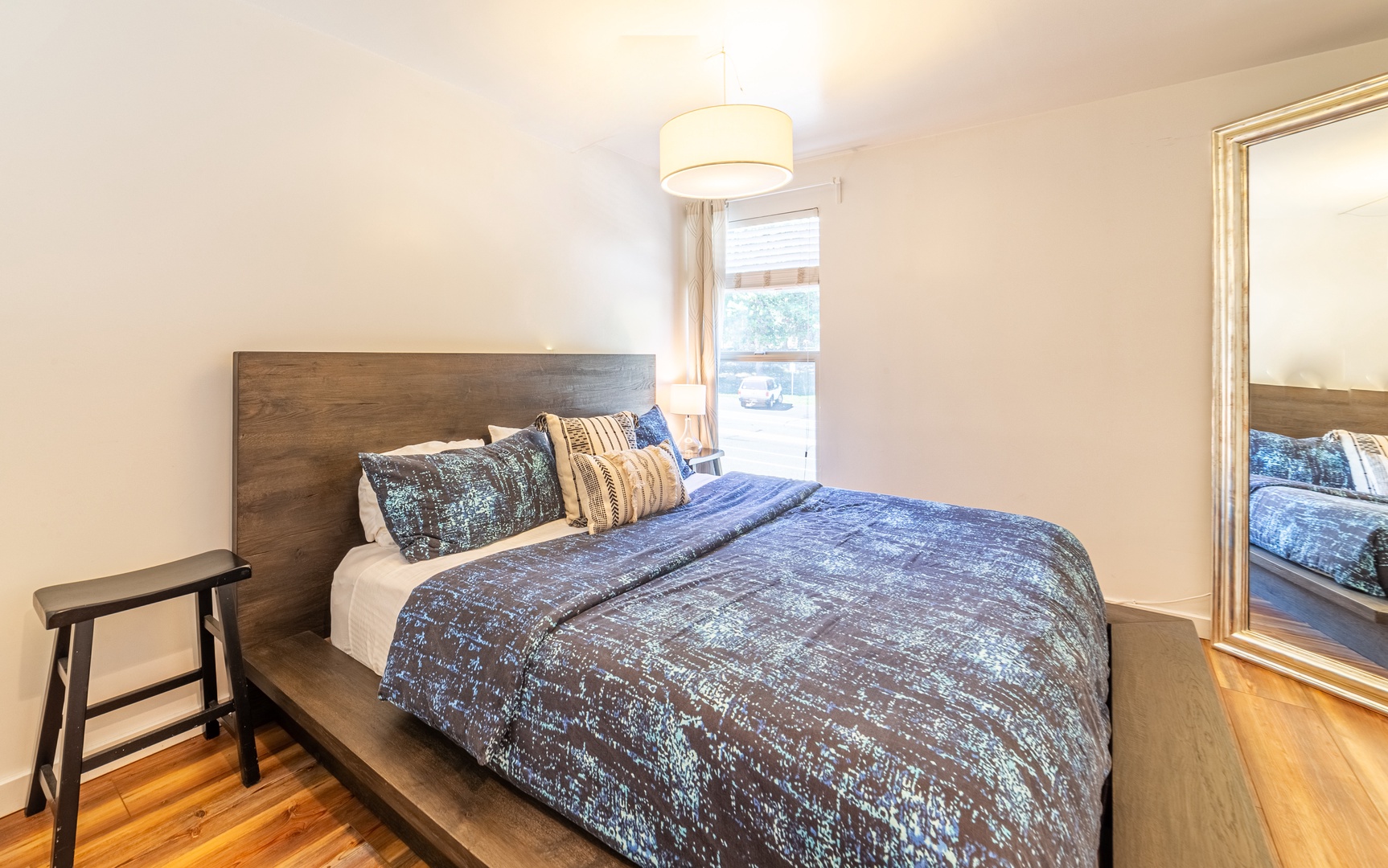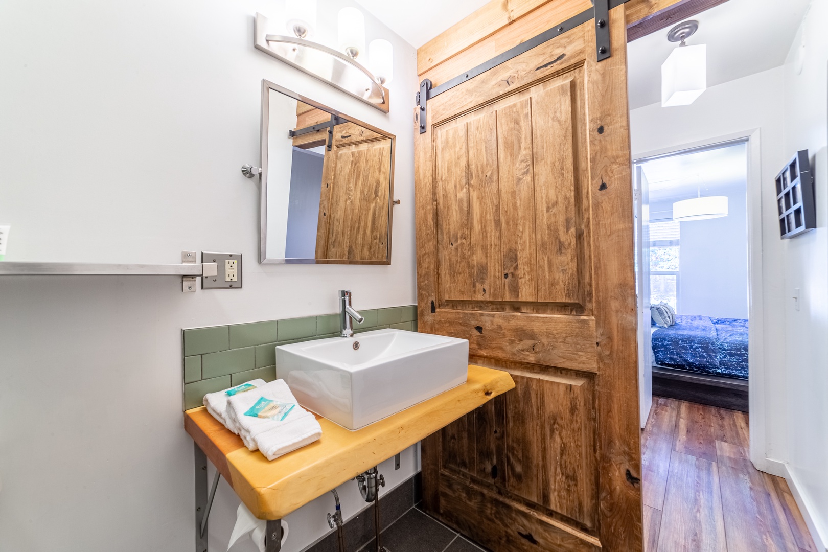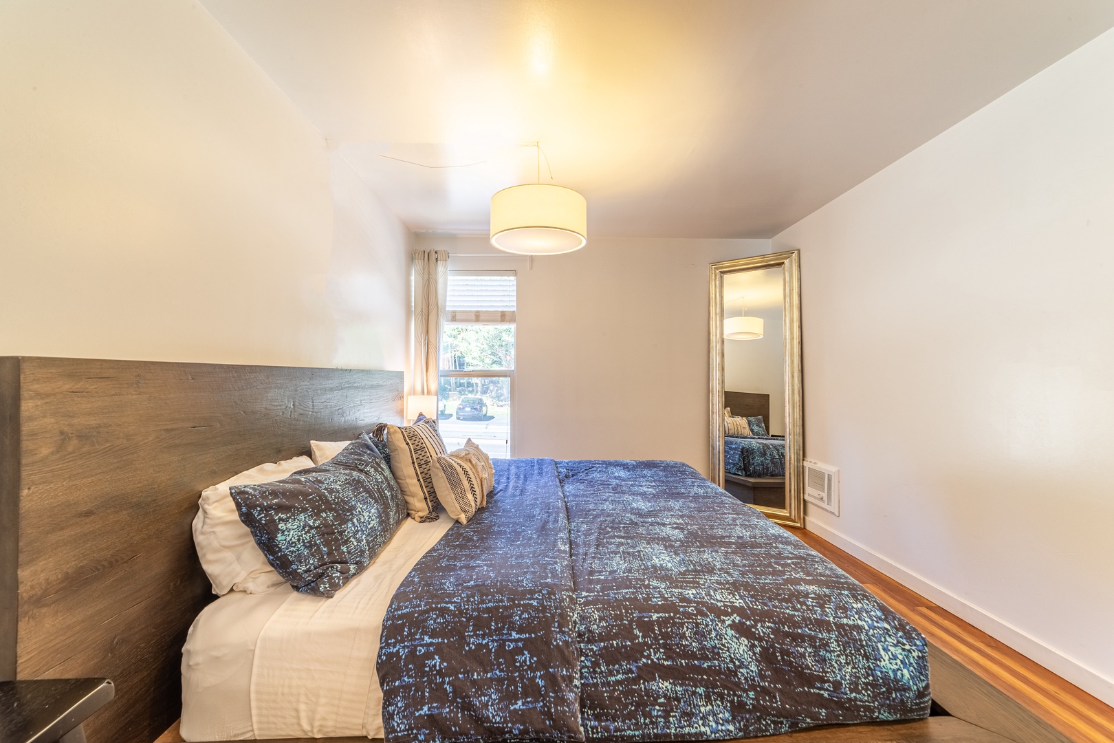 Inside Chamonix, you'll find an elegant blend of modern amenities and cozy touches. The newly remodeled kitchen features open shelving, locally crafted countertops, and brand-new appliances, fully stocked for all your cooking needs. Unwind in the living room with a 42" flat-screen TV, Blu-ray player, iPod dock, and a wood-burning stove with complimentary firewood, creating the perfect ambiance for a night in. The king-sized bed in the master bedroom promises luxurious rest, and the beautifully renovated bathroom includes a rainfall shower and a floating vanity for that spa-like feel.