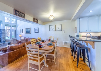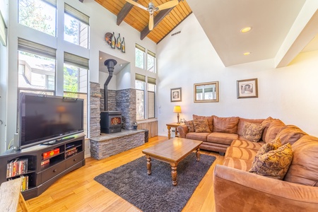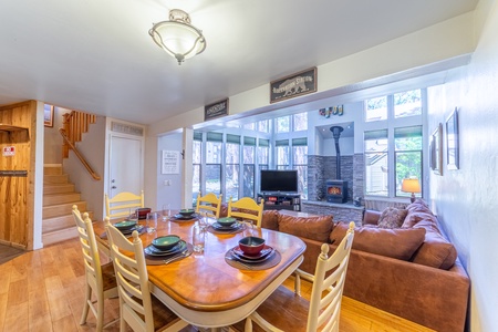 Step into a beautifully upgraded interior where the open-plan main level brings together a cozy living room, dining room, and fully equipped kitchen. The living room invites you to sink into an upgraded sofa, warm up by the thermostat-controlled pellet stove, and enjoy the 55" HDTV with Blu-ray. With high-speed wireless internet, it's easy to stay connected while enjoying your mountain retreat. The dining room seats six, with an additional two seats at the breakfast bar, making mealtimes a breeze in this fully stocked kitchen.