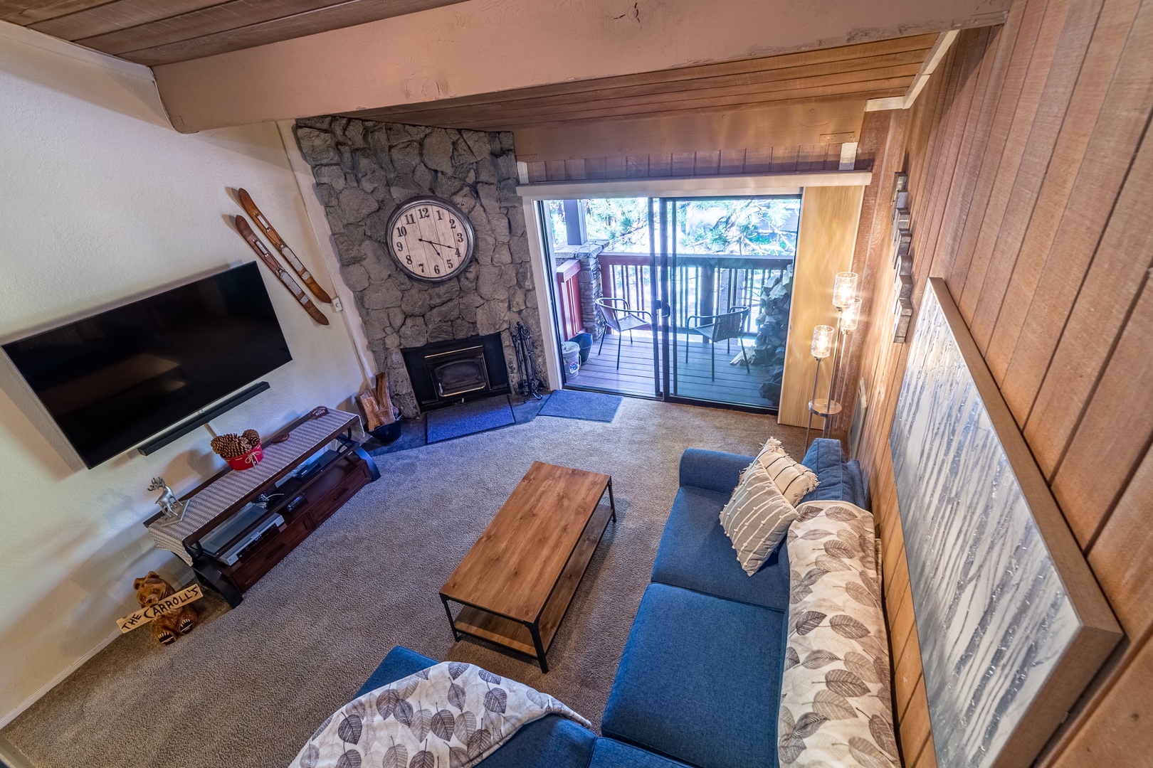 With rustic wood-paneled walls and a grand stone fireplace, the living room exudes alpine charm. Relax by the fire with complimentary firewood, enjoy a movie on the flat-screen TV, or take in the fresh mountain air from the balcony. The fully-equipped kitchen and dining area make meal prep a breeze, while the loft bunk beds add a fun touch for kids and families. Each bedroom offers a flat-screen TV for your entertainment, ensuring comfort and convenience throughout.