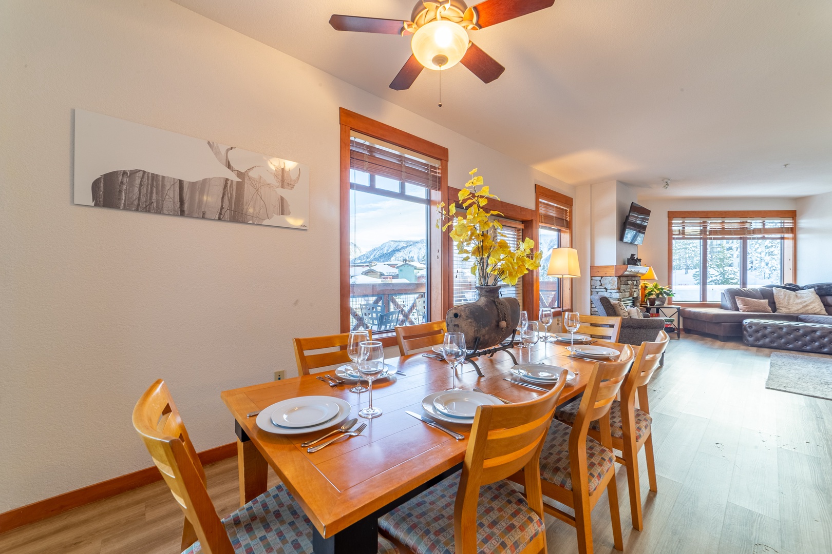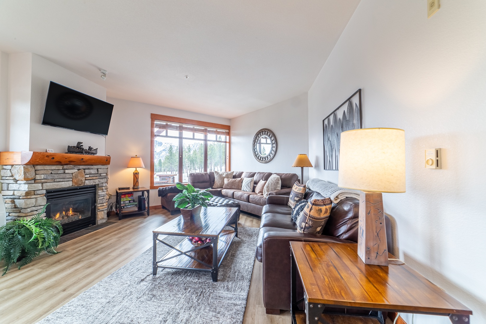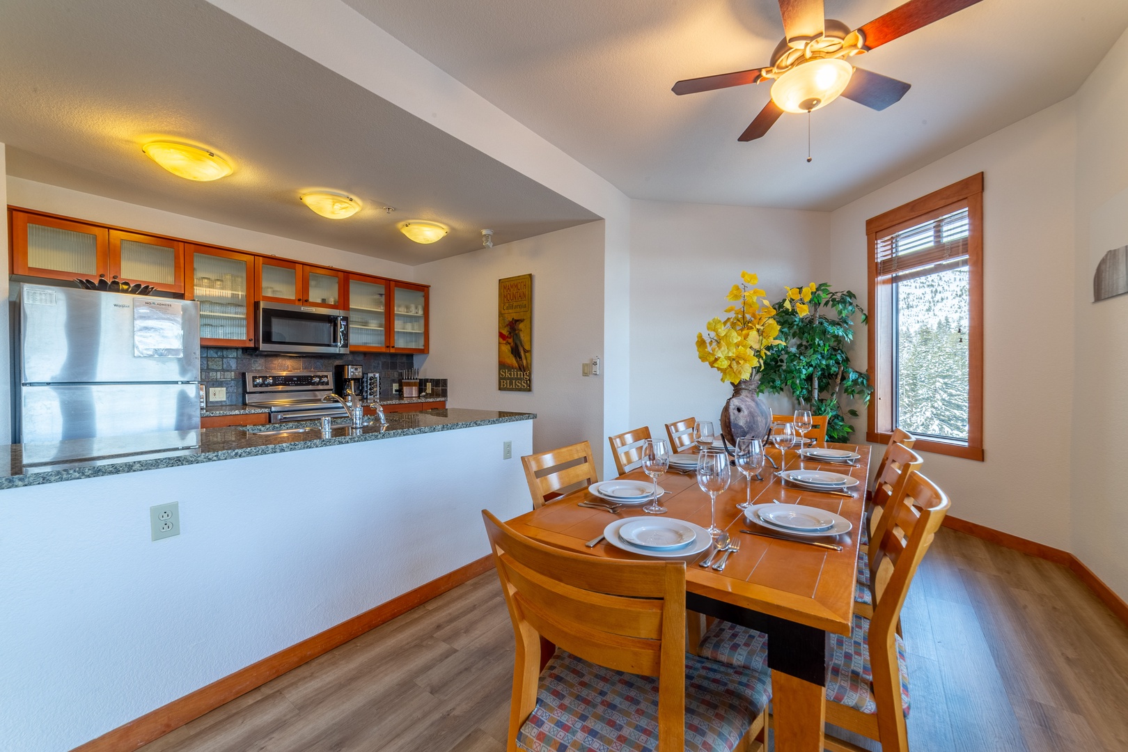 Step into a spacious, light-filled living area designed for comfort and style. Expansive windows bring in natural light, while the cozy fireplace and flat-screen TV make the living room perfect for movie nights after a day of adventure. The recently remodeled kitchen features an island and a full-size dining table-rare for a condo this size-creating an ideal setting for cooking and dining together. Fully stocked with all the essentials, the kitchen invites you to create memorable meals with family and friends.