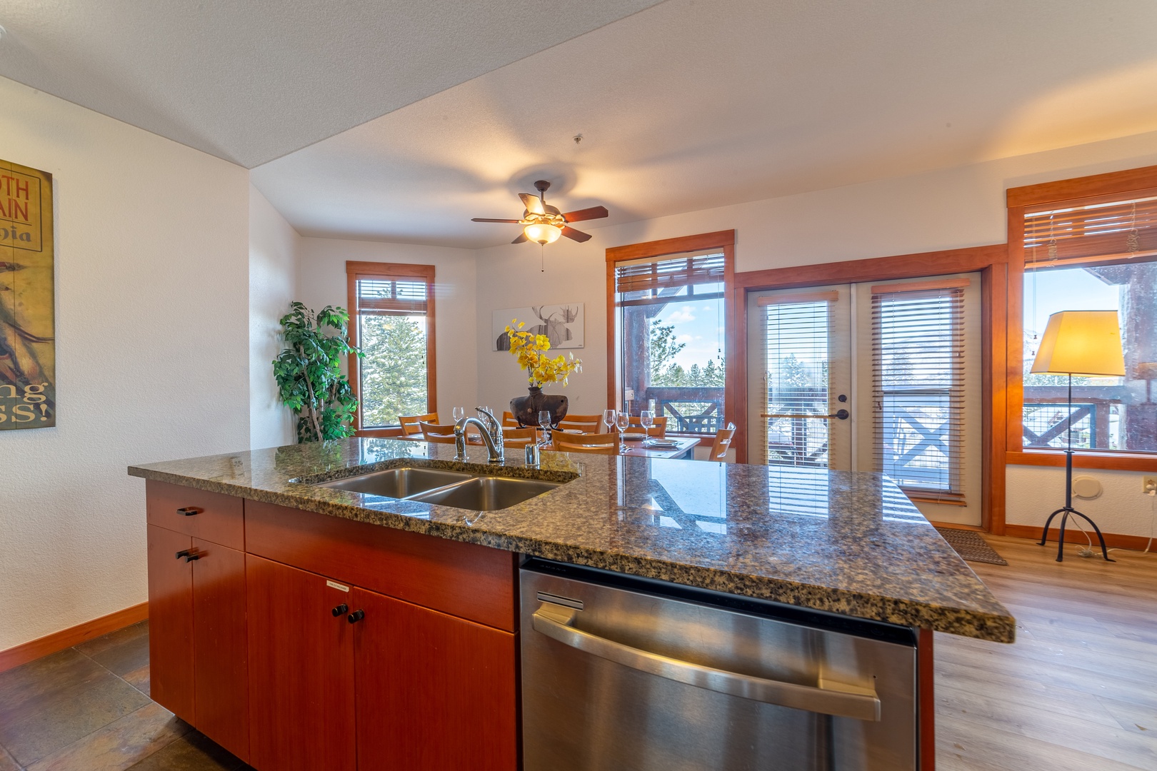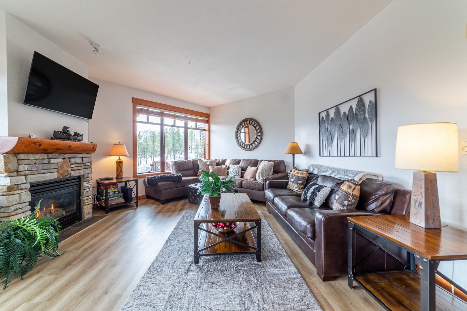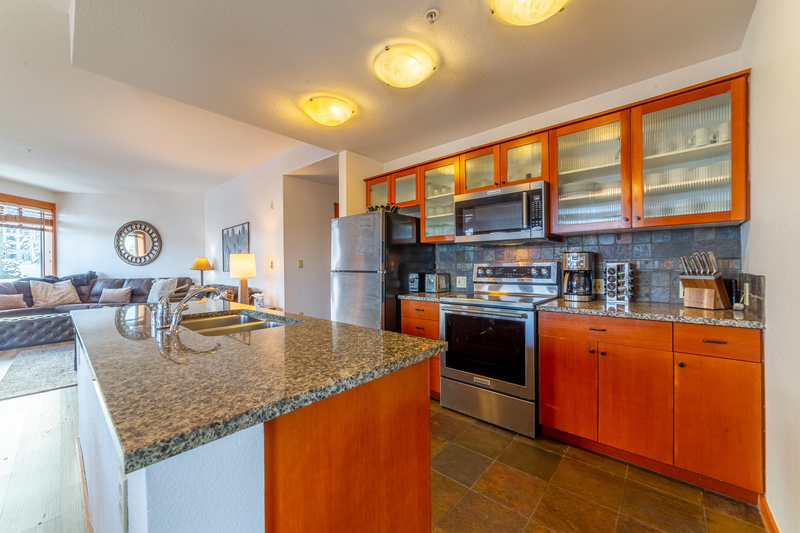 Step into a spacious, light-filled living area designed for comfort and style. Expansive windows bring in natural light, while the cozy fireplace and flat-screen TV make the living room perfect for movie nights after a day of adventure. The recently remodeled kitchen features an island and a full-size dining table-rare for a condo this size-creating an ideal setting for cooking and dining together. Fully stocked with all the essentials, the kitchen invites you to create memorable meals with family and friends.