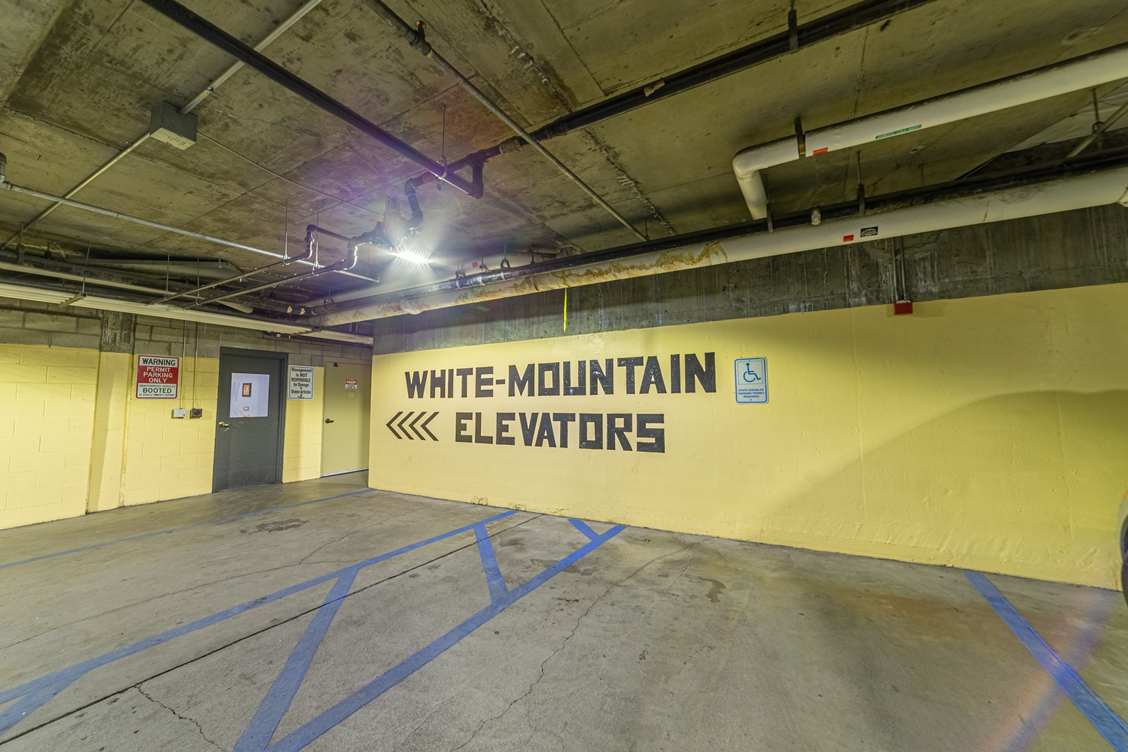 Parking pillars yellow & labeled "W" for White Mountain guests!