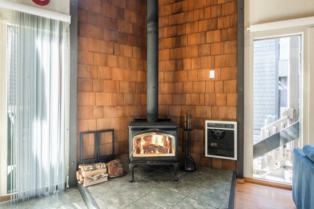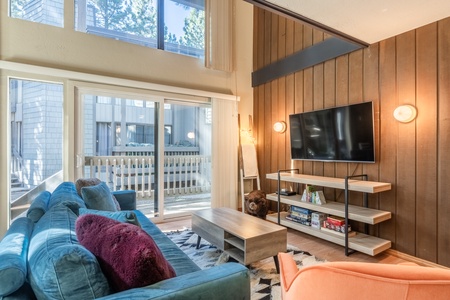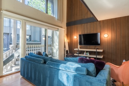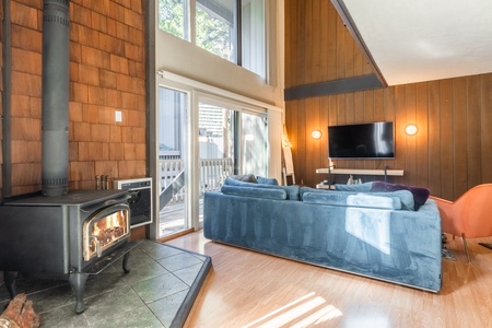 Step into a bright, airy living space with vaulted beam ceilings and floor-to-ceiling windows that let in stunning natural light. A cozy wood-burning fireplace sets the stage for relaxing evenings after a day of outdoor adventures. The fully equipped kitchen has everything you need to whip up hearty meals, and the adjacent dining area is perfect for gathering together. The loft-style bedroom offers a comfortable haven for rest, complete with ample storage and a serene mountain vibe. With 1.5 bathrooms, your group will have plenty of space to refresh and recharge. Two private decks invite you to soak in the mountain views and breathe in the crisp Sierra air.