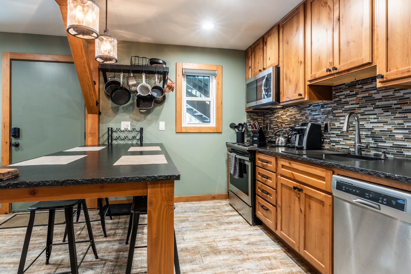-A fully equipped modern kitchen with new appliances and a peninsula dining area.
