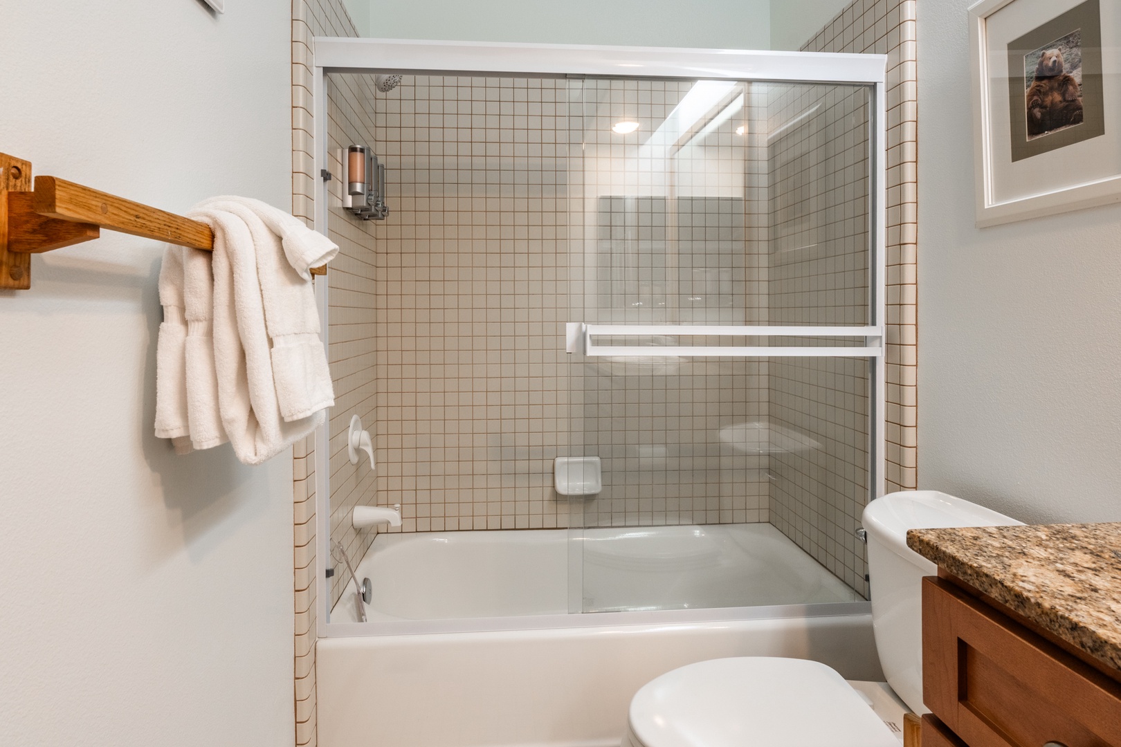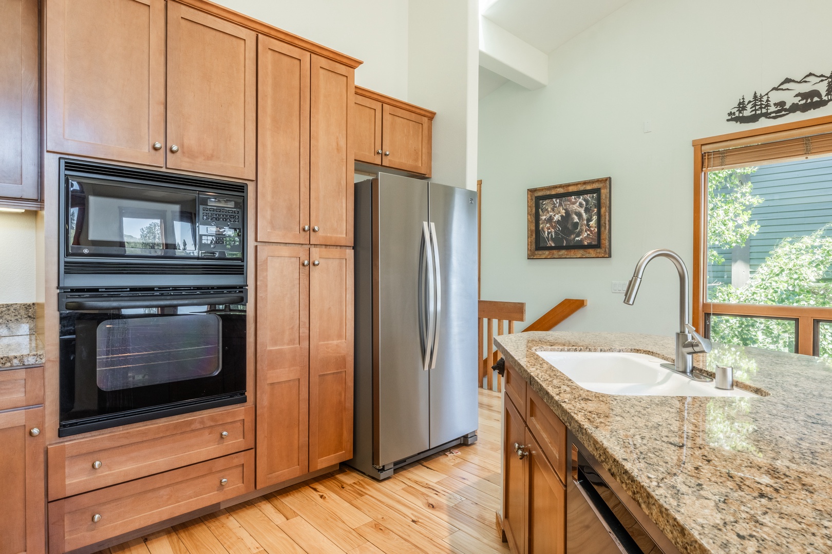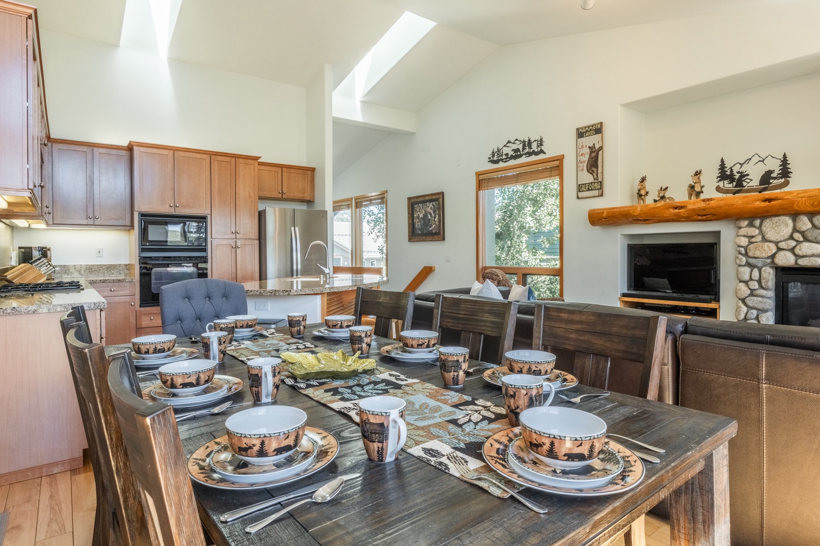 The well-equipped kitchen features granite counters, modern appliances, and bar seating, making it easy to prepare everything from quick breakfasts before heading to the mountain to hearty family dinners at the end of the day. It’s stocked with cookware, utensils, and dinnerware, so you’ll have all the essentials on hand without needing to bring anything from home. Thoughtful touches like a coffee maker and microwave add convenience, while the open layout allows the chef to stay connected with the rest of the group in the living room.