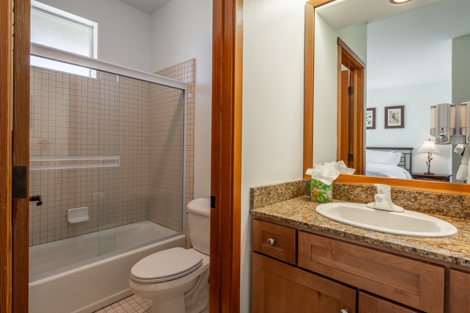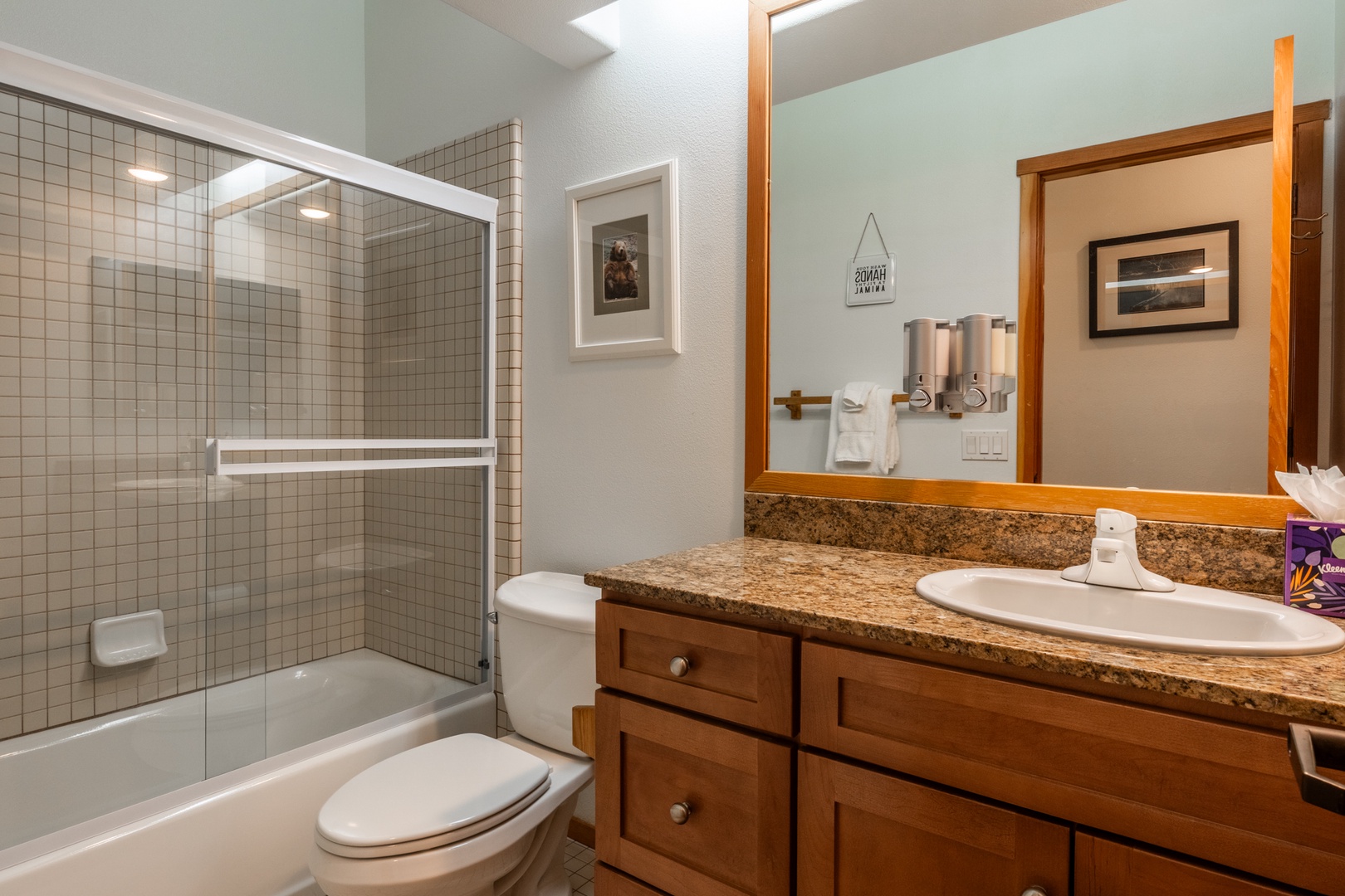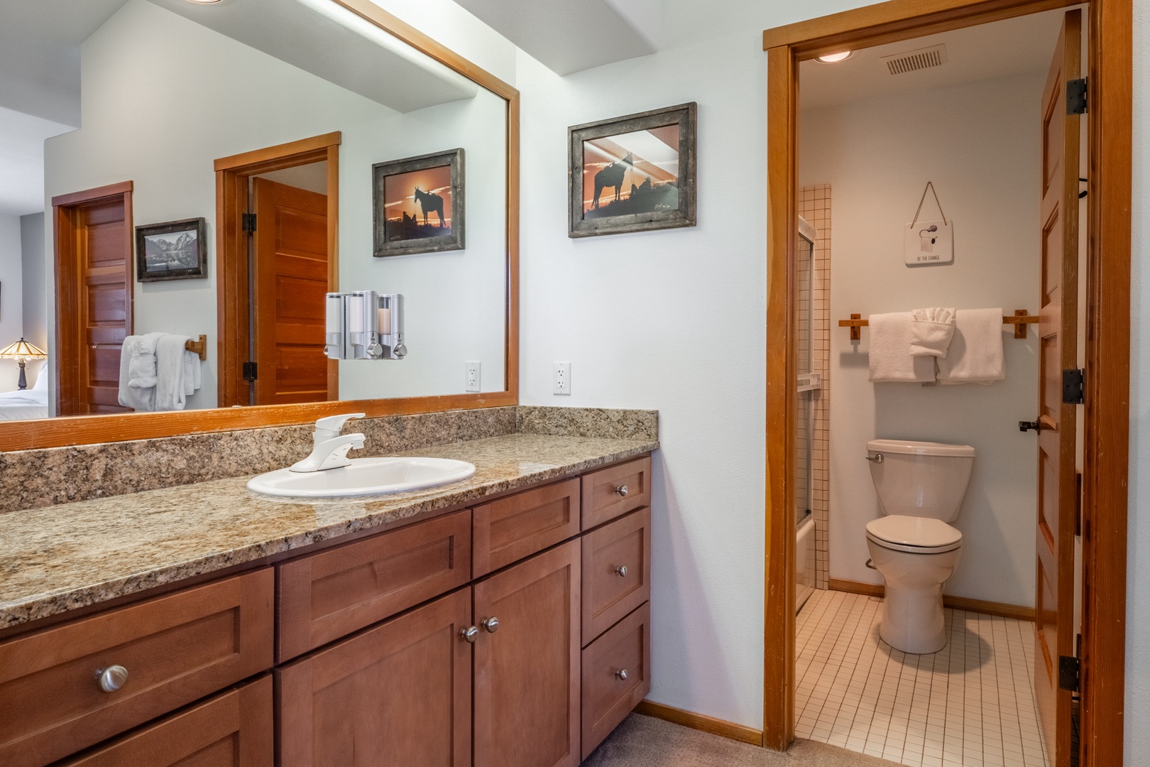 Each of the three bedrooms is a private retreat, complete with cozy bedding and mountain-inspired décor. The primary suite features a king bed, its own private bath, and peaceful views. The second bedroom offers a queen bed for additional comfort and convenience. The third bedroom includes a king bed, flat-screen TV, and en-suite bath with a granite vanity and tiled shower/tub, providing both comfort and privacy for a relaxing retreat. A full laundry room and attached garage make longer stays easy and convenient.