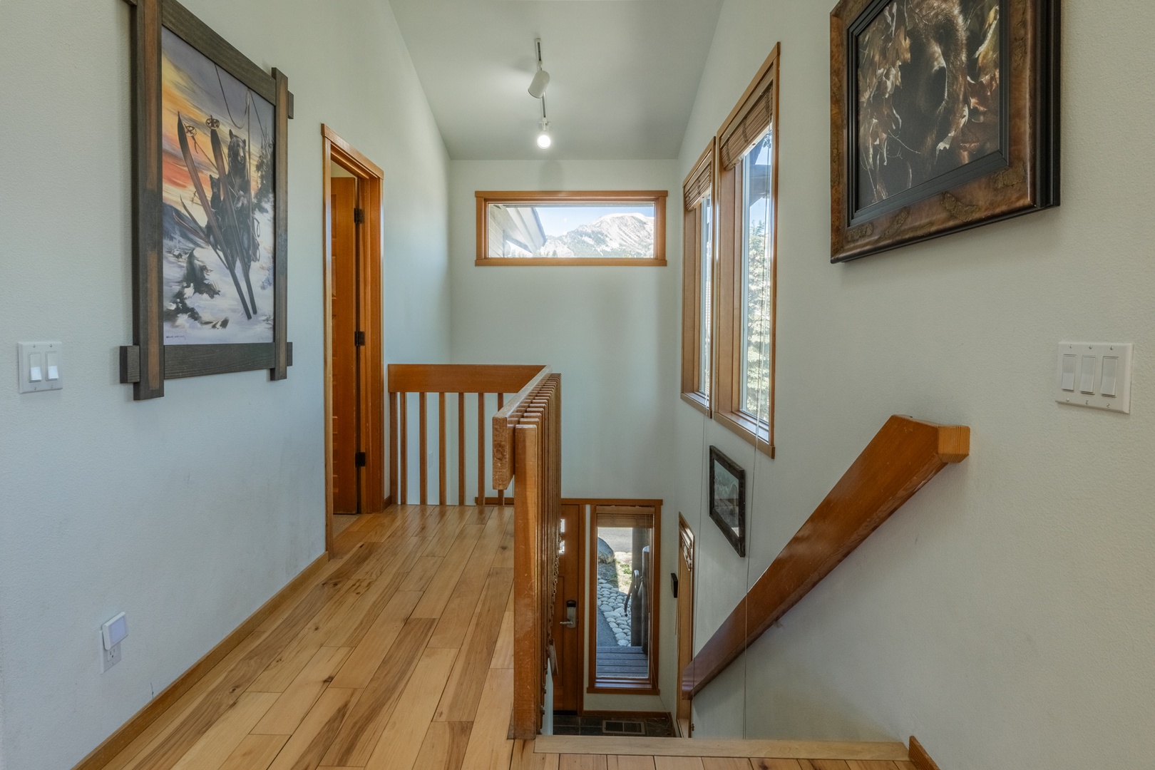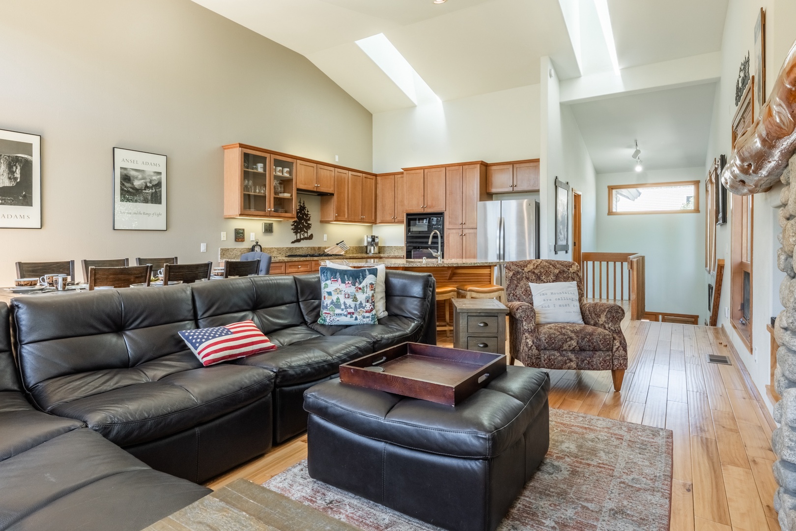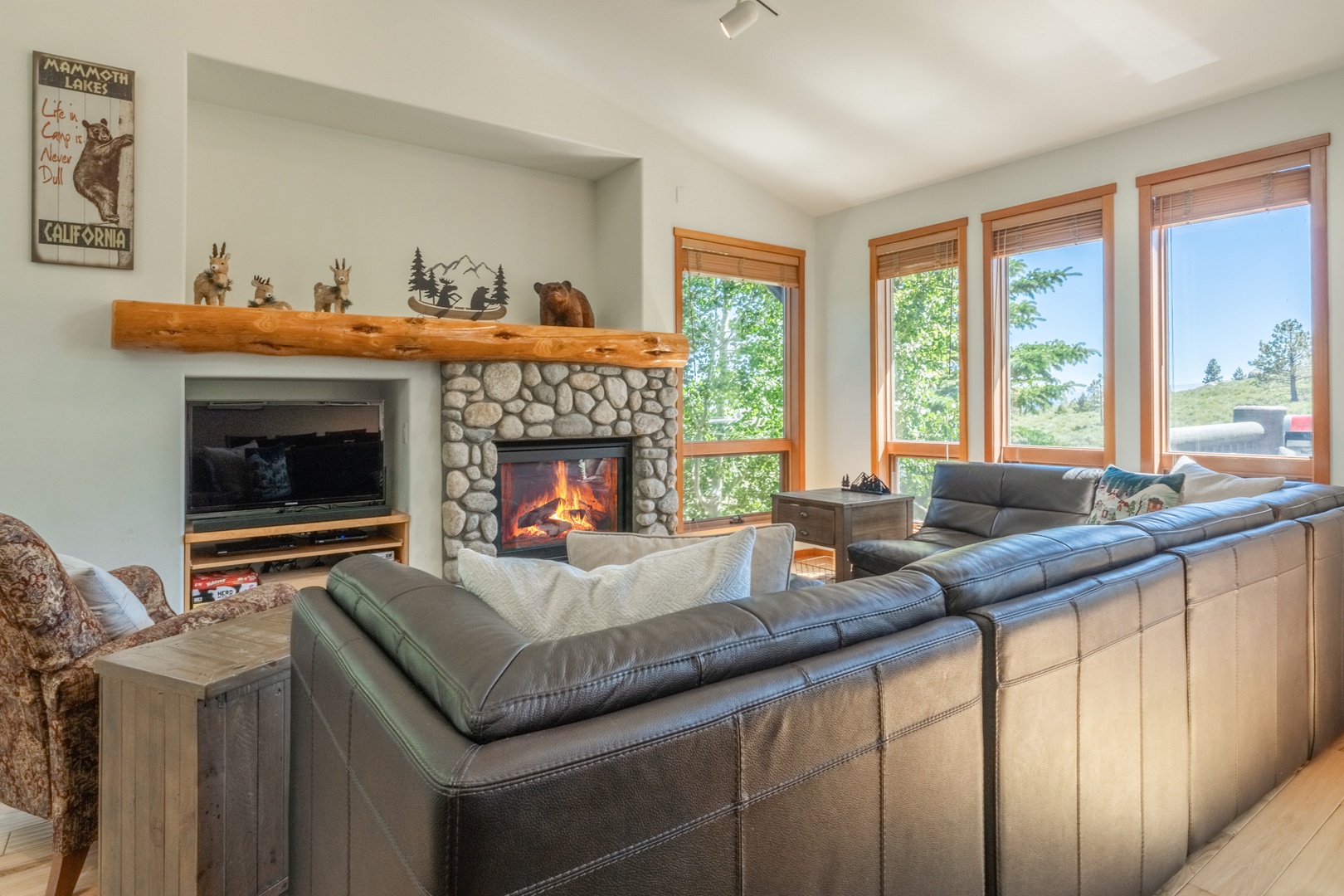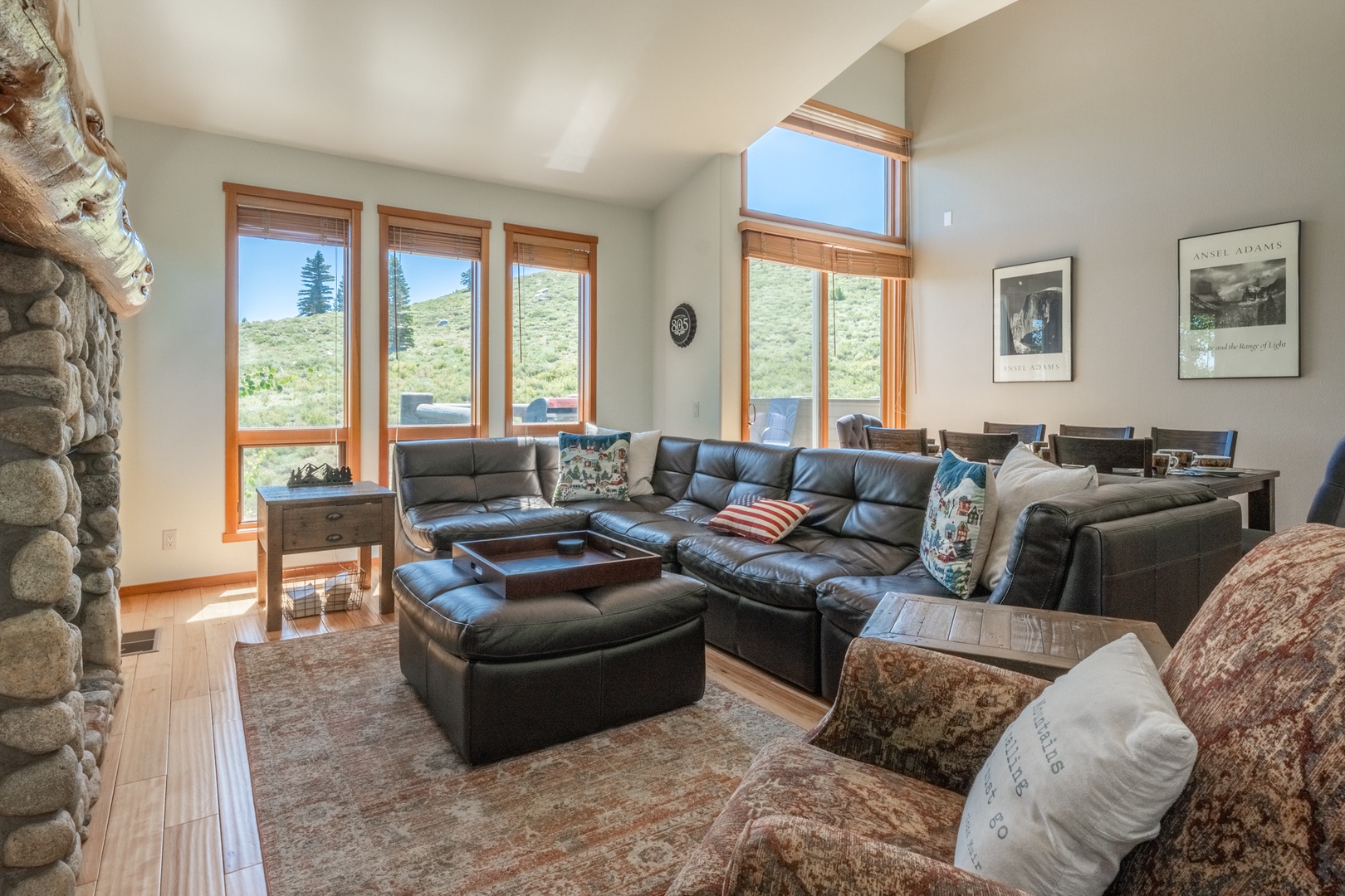 Step inside to find a bright and inviting great room featuring an open and airy living room with tall windows that frame mountain views and fill the space with natural light. The stone fireplace with a rustic wood mantel creates a cozy centerpiece, while a spacious sofa arranged for cozy evenings makes it the perfect place to relax after mountain adventures.