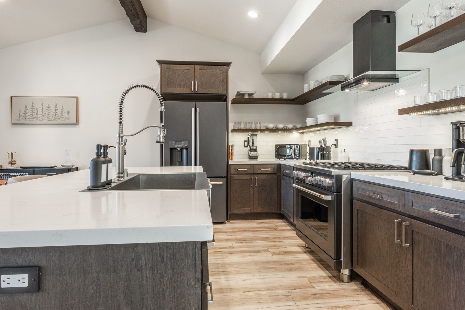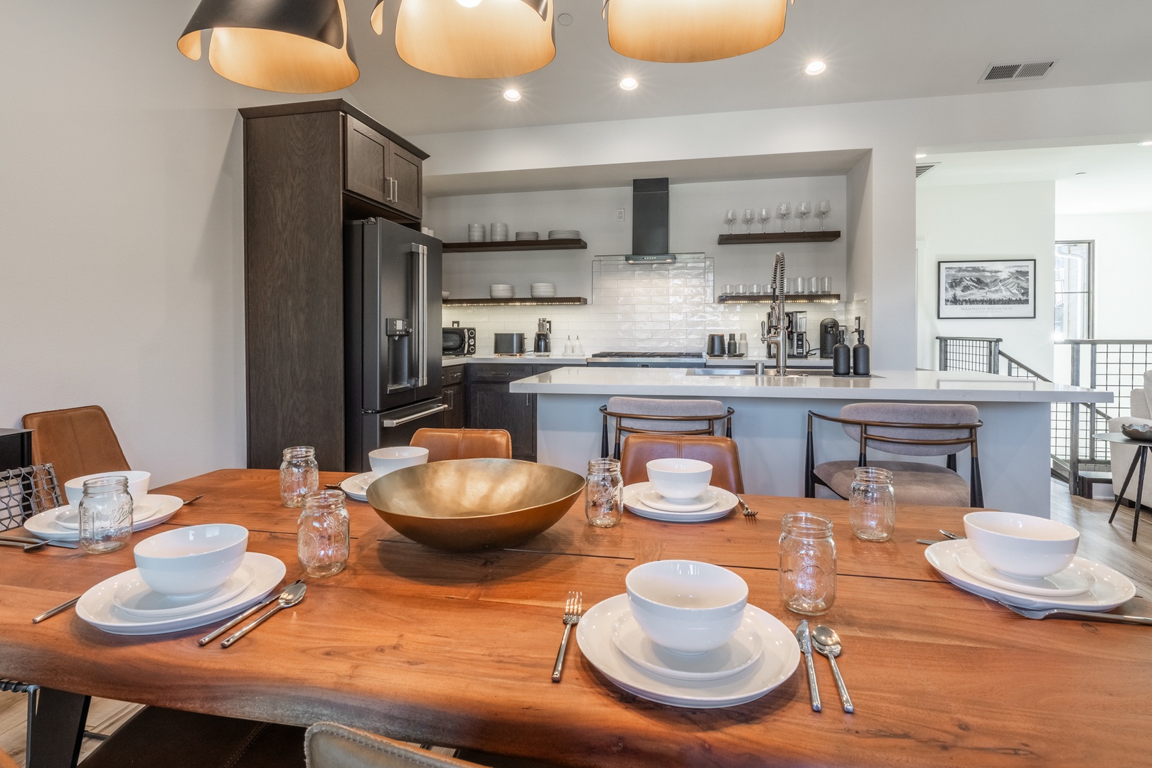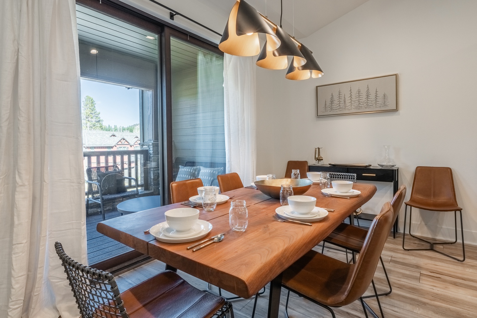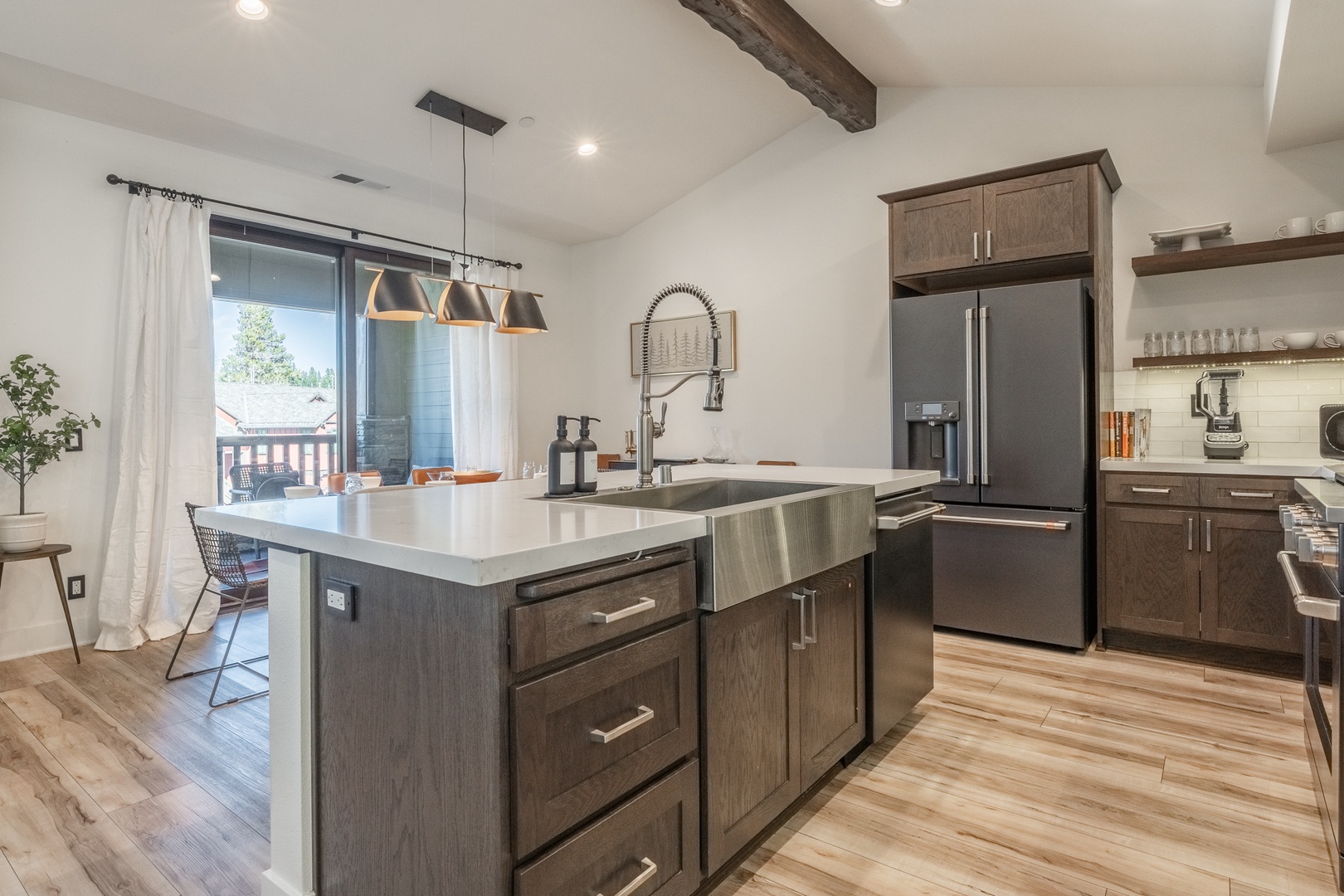 The kitchen stands out as a true centerpiece of the home, designed with both beauty and function in mind. Sleek matte-black appliances, a professional gas range, and polished quartz countertops create an upscale, modern feel. A spacious island offers additional seating and prep space, while the deep farmhouse sink and stylish hardware add a sophisticated touch. Open shelving showcases neatly arranged dishware, glassware, and essentials, giving the entire space a clean, curated look that feels straight out of a luxury mountain home. Whether you’re preparing a full meal or gathering for morning coffee, this kitchen delivers style, convenience, and a high-end cooking experience. Nearby, a live-edge dining table sits beneath modern lighting and leads directly to the covered deck for seamless indoor–outdoor enjoyment.