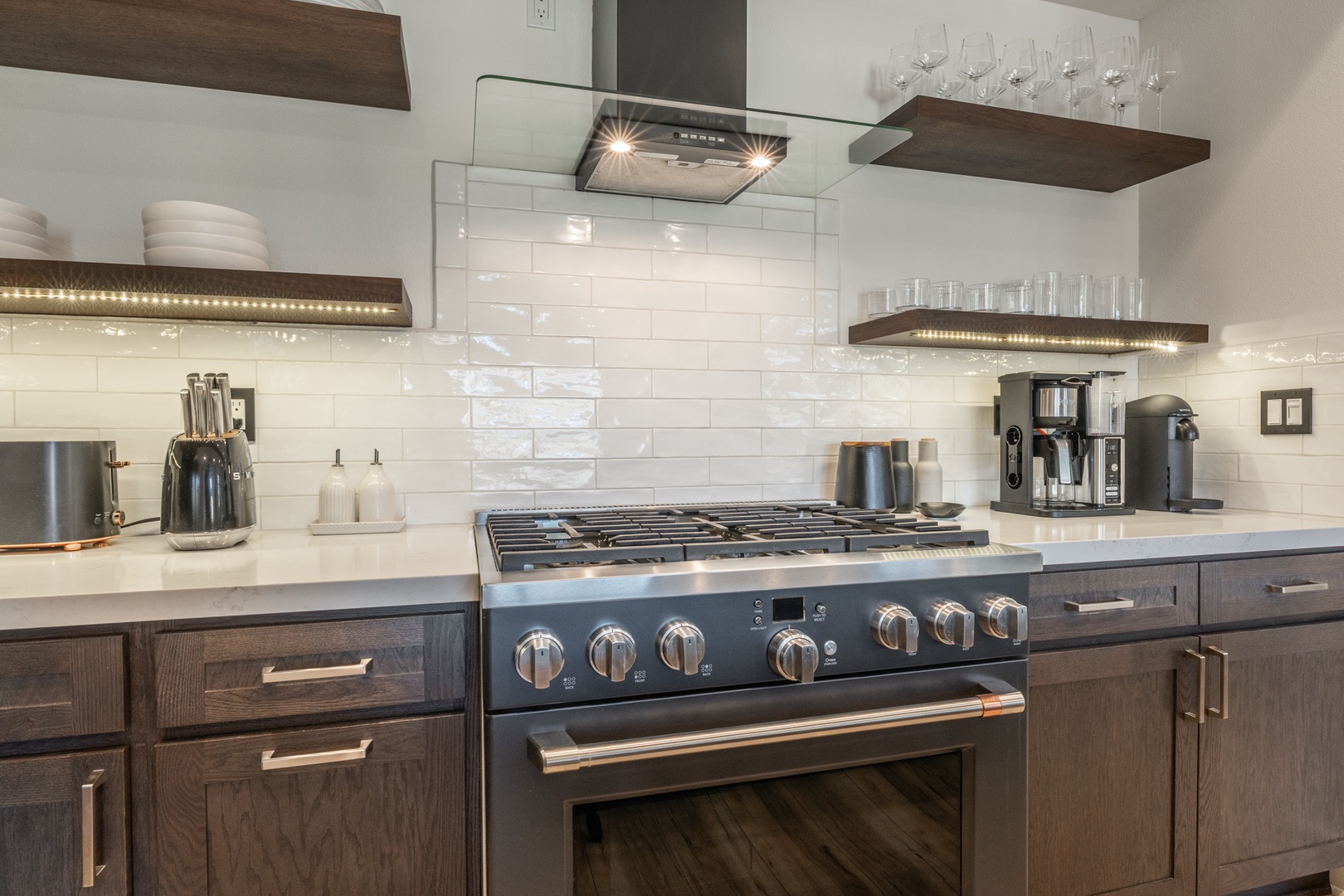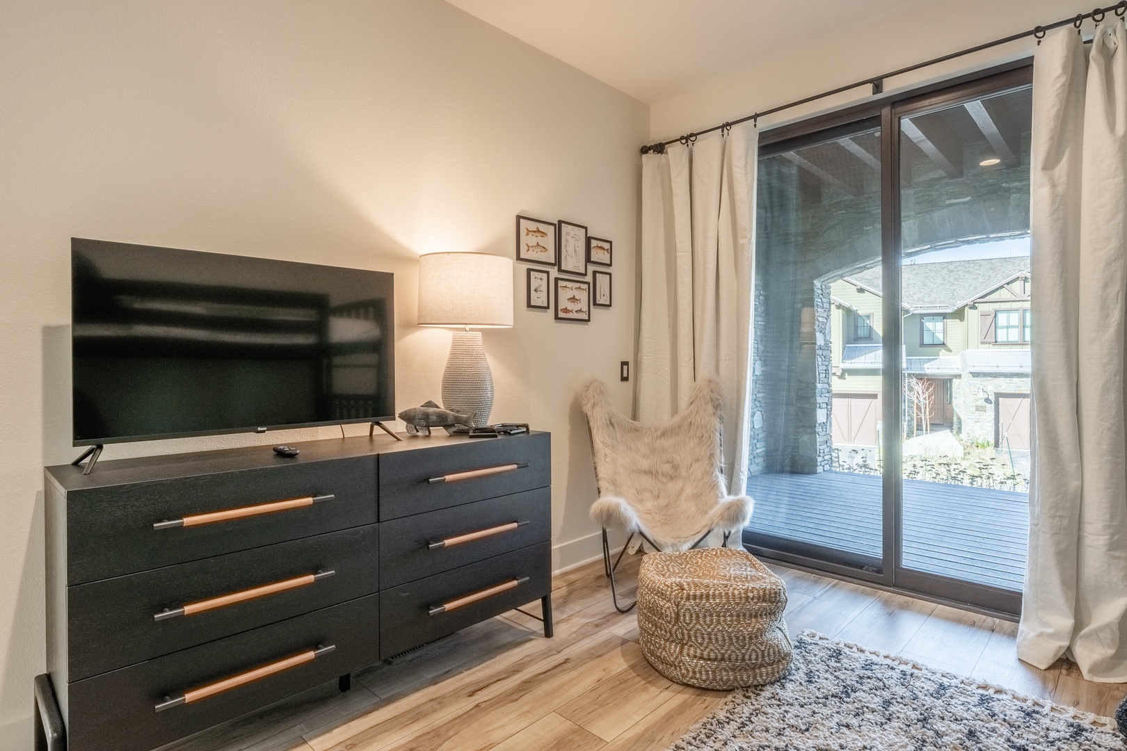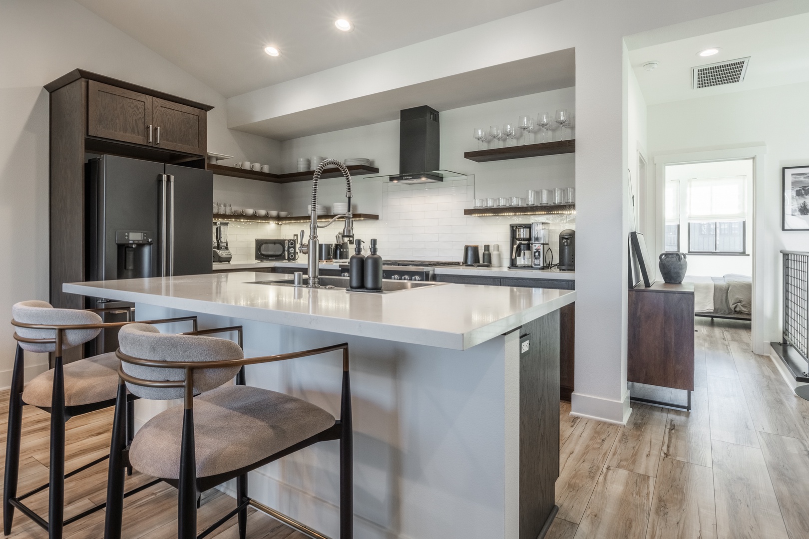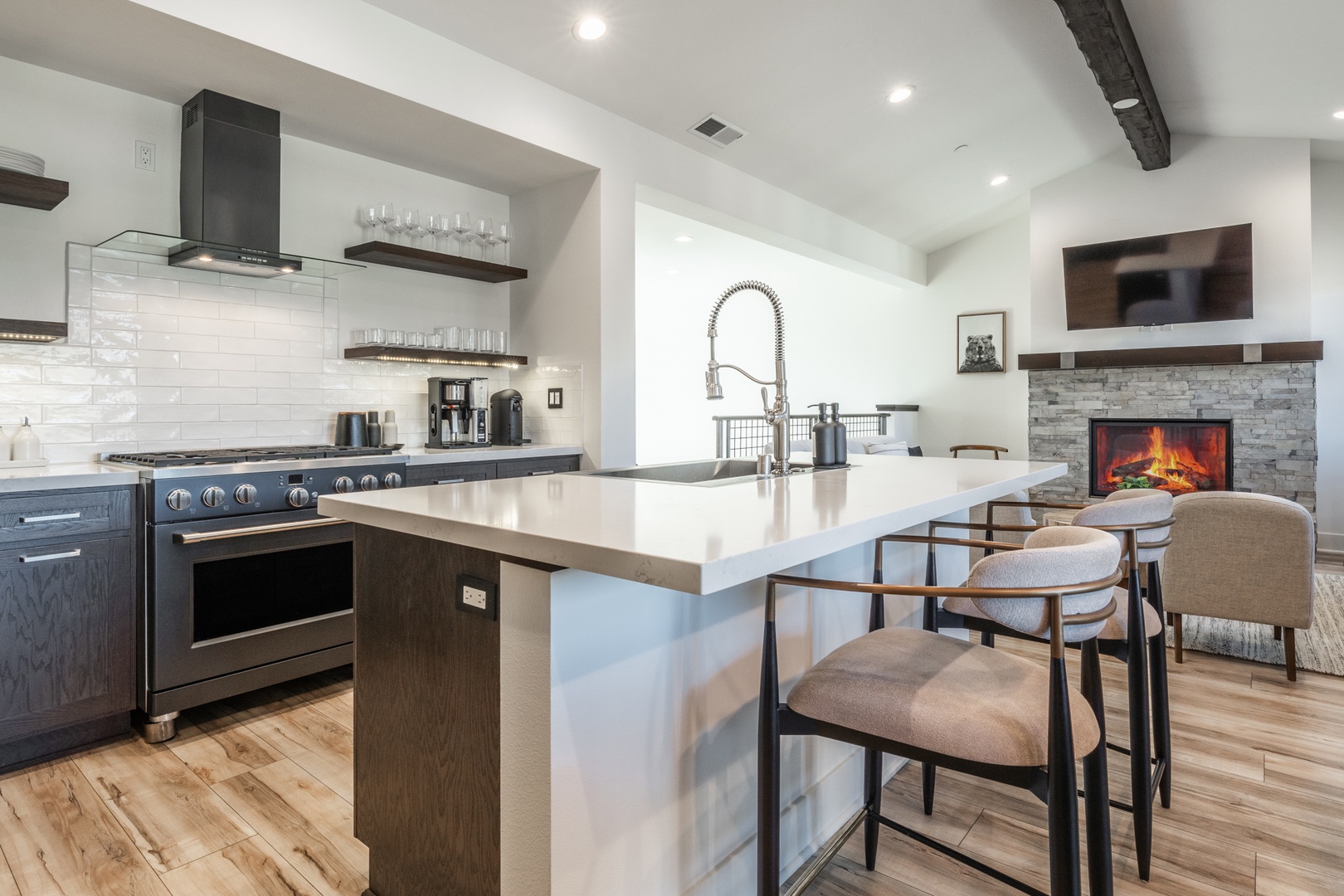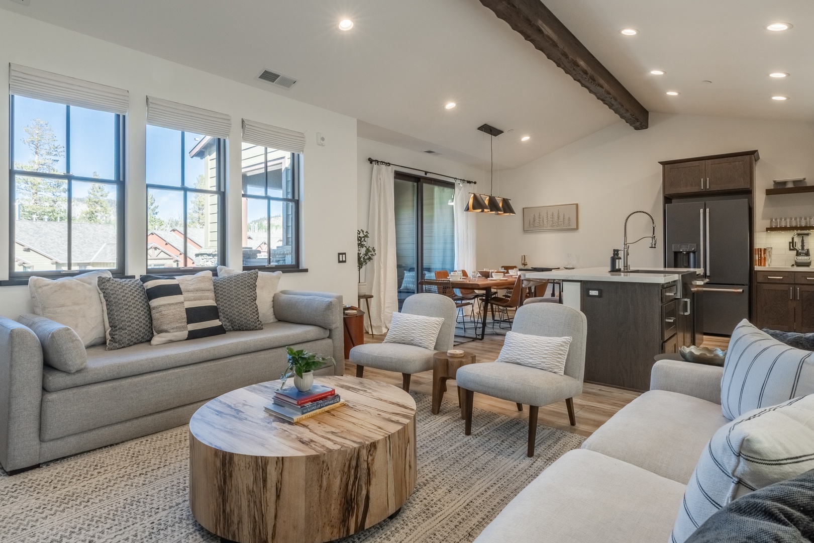 The kitchen stands out as a true centerpiece of the home, designed with both beauty and function in mind. Sleek matte-black appliances, a professional gas range, and polished quartz countertops create an upscale, modern feel. A spacious island offers additional seating and prep space, while the deep farmhouse sink and stylish hardware add a sophisticated touch. Open shelving showcases neatly arranged dishware, glassware, and essentials, giving the entire space a clean, curated look that feels straight out of a luxury mountain home. Whether you’re preparing a full meal or gathering for morning coffee, this kitchen delivers style, convenience, and a high-end cooking experience. Nearby, a live-edge dining table sits beneath modern lighting and leads directly to the covered deck for seamless indoor–outdoor enjoyment.