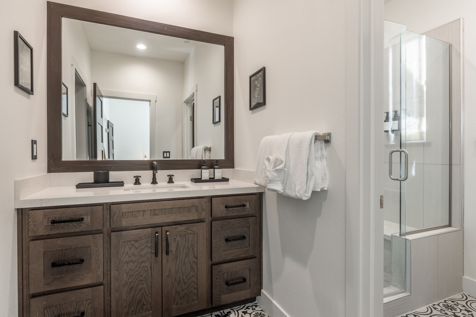 The primary retreat offers a peaceful escape with tall ceilings, large windows, a queen bed, a spacious walk-in closet, and a beautifully finished bathroom with dual sinks and a glass walk-in shower. A stylish powder room is also located on this level for added convenience. Downstairs, the second bedroom features a queen bed with soft, calming décor, while the third bedroom includes a twin-over-twin bunk bed with a trundle bed and direct access to the lower patio. The second full bathroom sits just steps from both the second and third bedrooms, creating an easy and comfortable setup for guests. A full-size stackable washer and dryer and a large two-car garage complete the interior, offering practical convenience for longer stays and year-round mountain adventures.