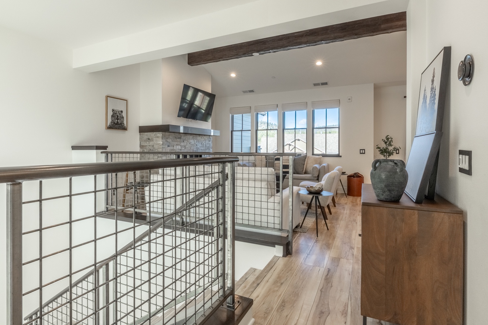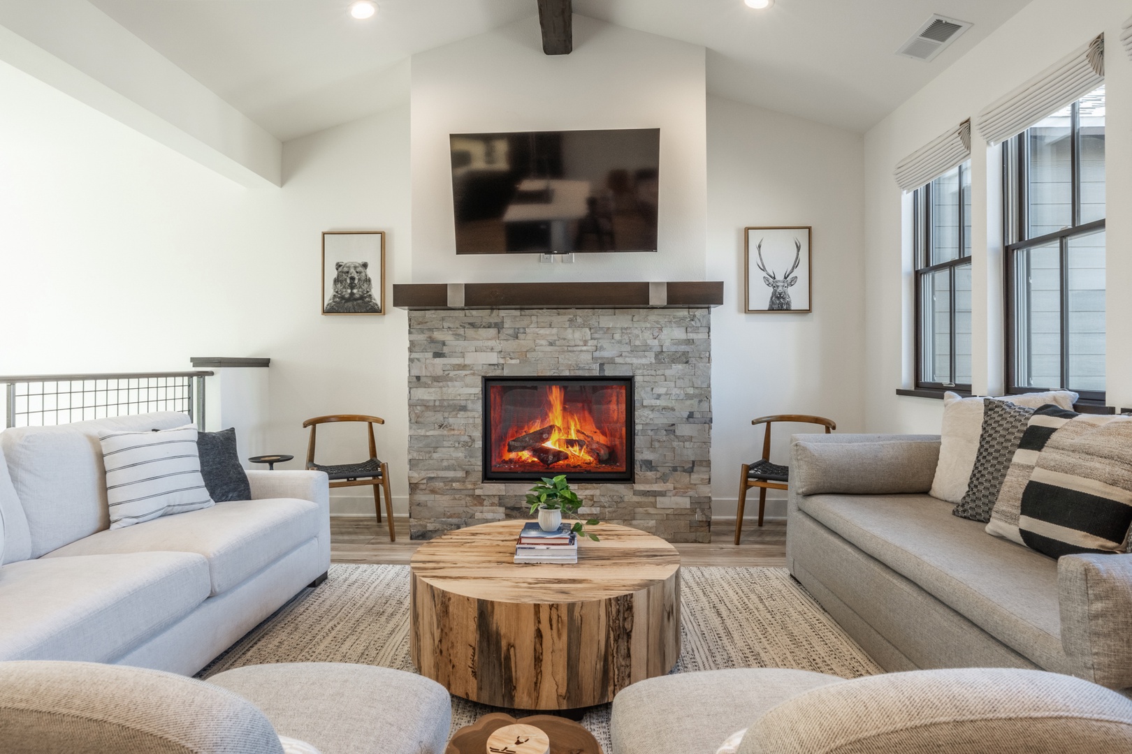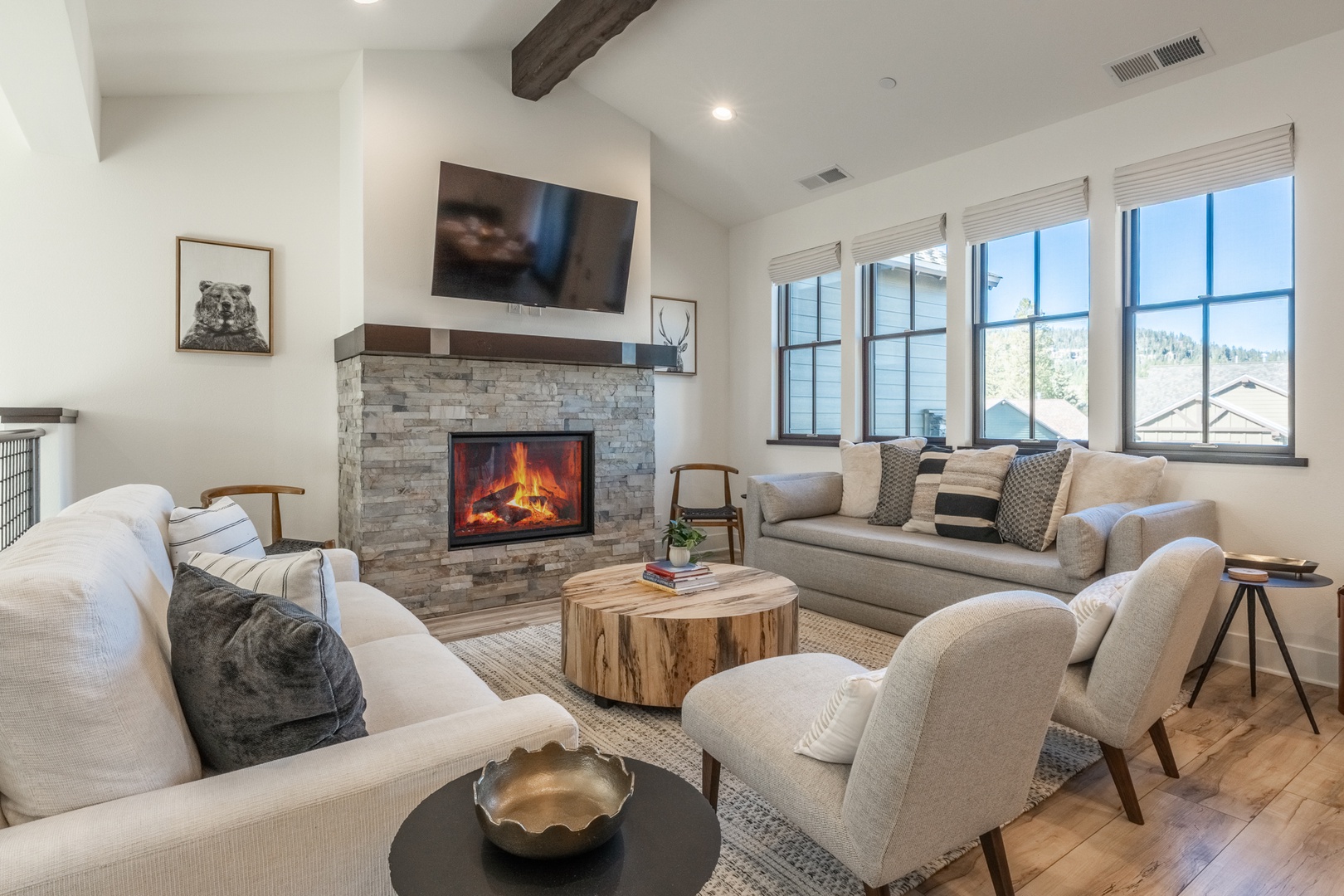 Step inside and discover a bright, thoughtfully designed living space filled with natural light and upscale finishes. Vaulted ceilings and expansive windows frame beautiful mountain views while creating a warm, inviting atmosphere. A striking stone fireplace anchors the main living area, offering a cozy place to unwind after time on the mountain.