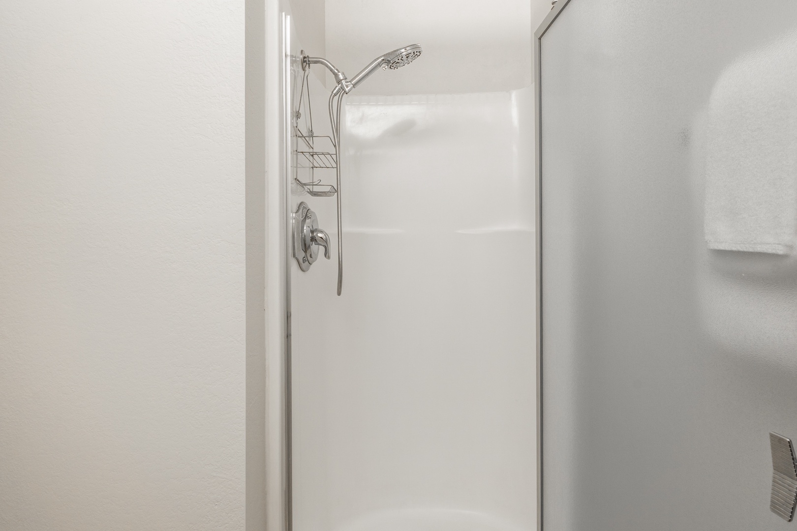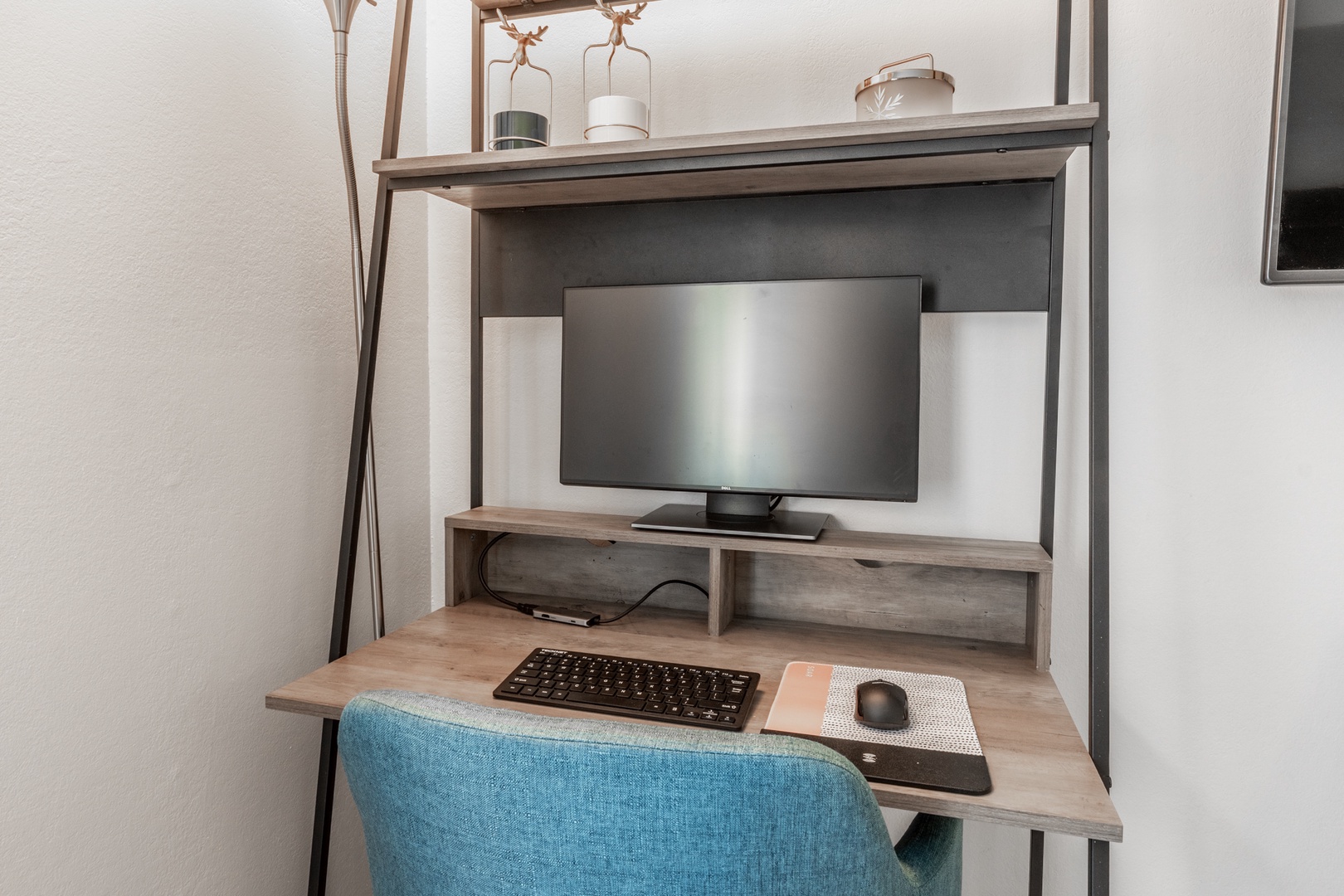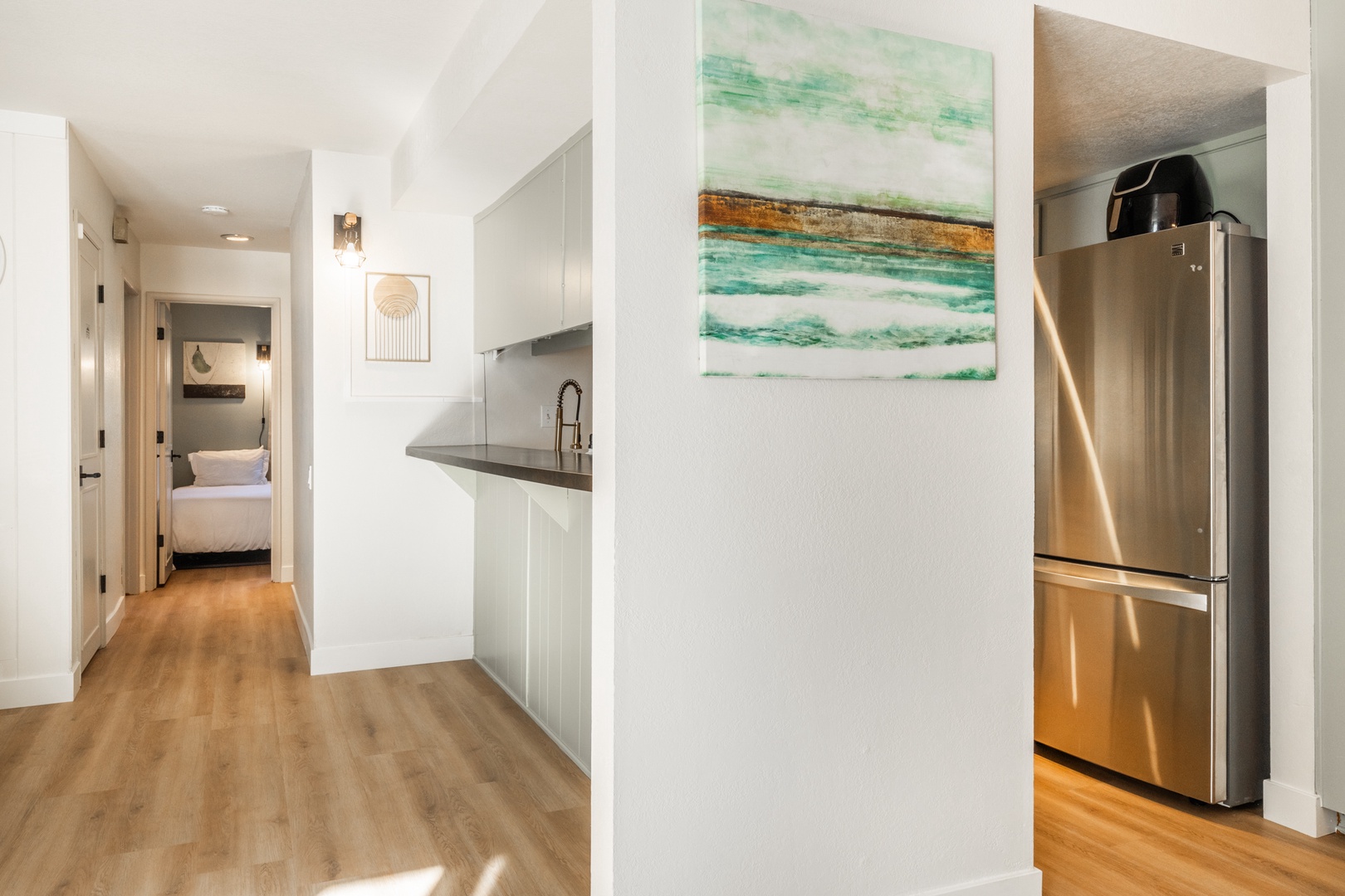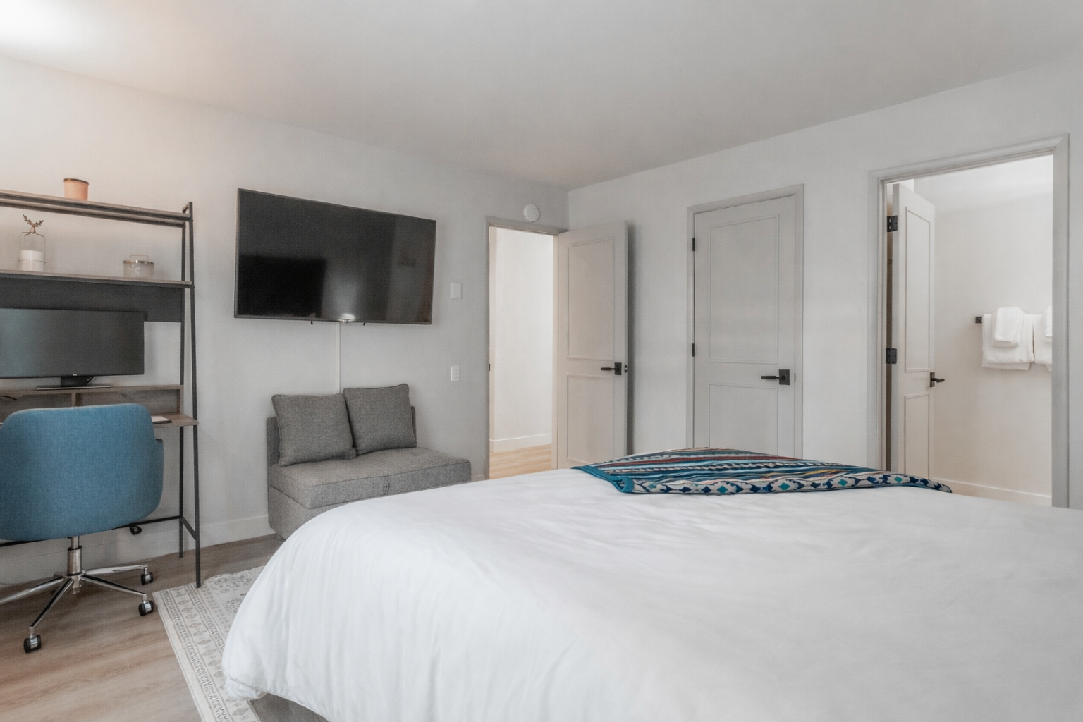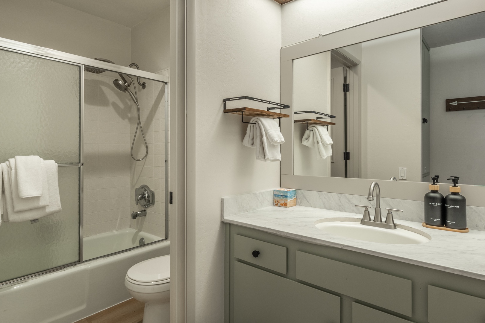 When it’s time to unwind, the condo offers two well-appointed bedrooms designed for comfort and privacy. The primary bedroom features a king bed and includes an attached bathroom, creating a private space to relax at the end of the day. This bathroom is laid out with a clean vanity, mirror, and updated finishes, offering a simple and functional setup for daily routines. The primary bedroom also includes a dedicated desk with a computer, making it a great option for remote work or planning your day in a quiet setting.