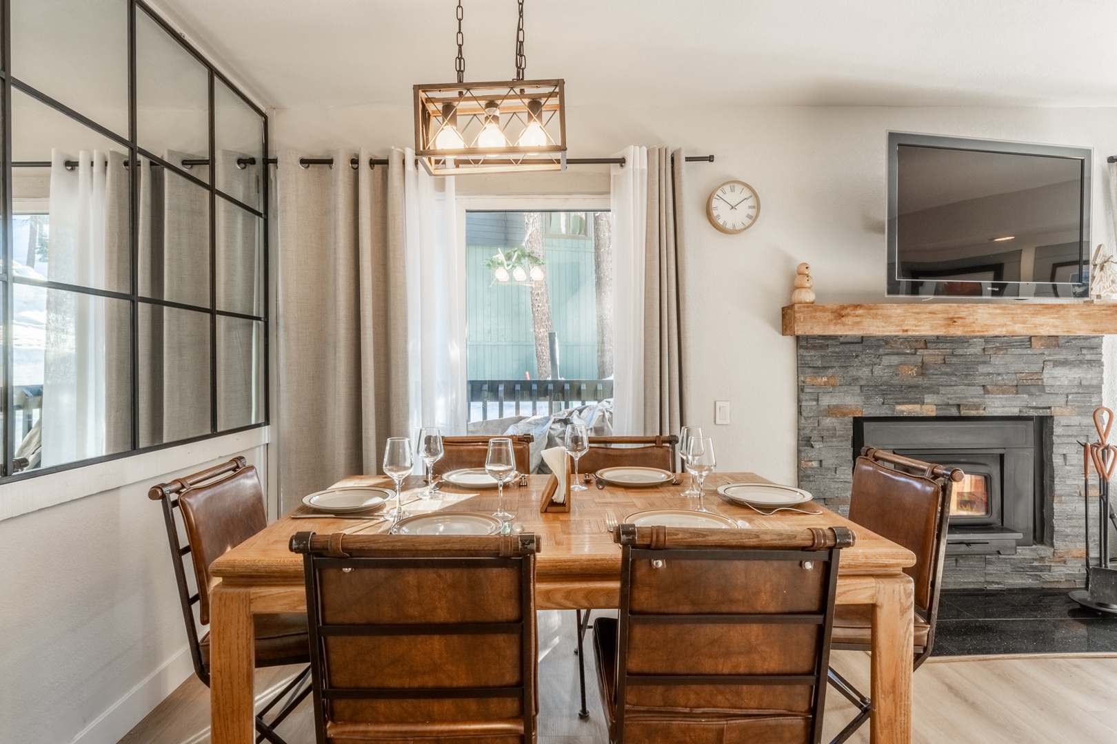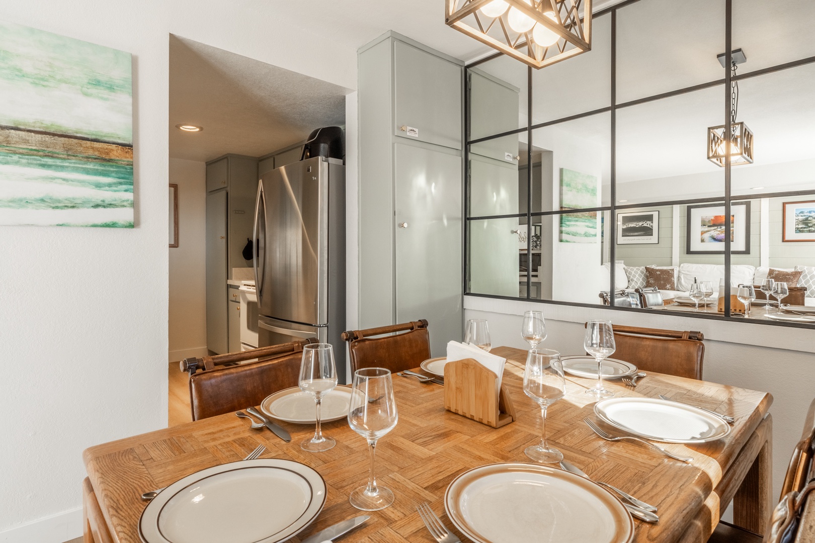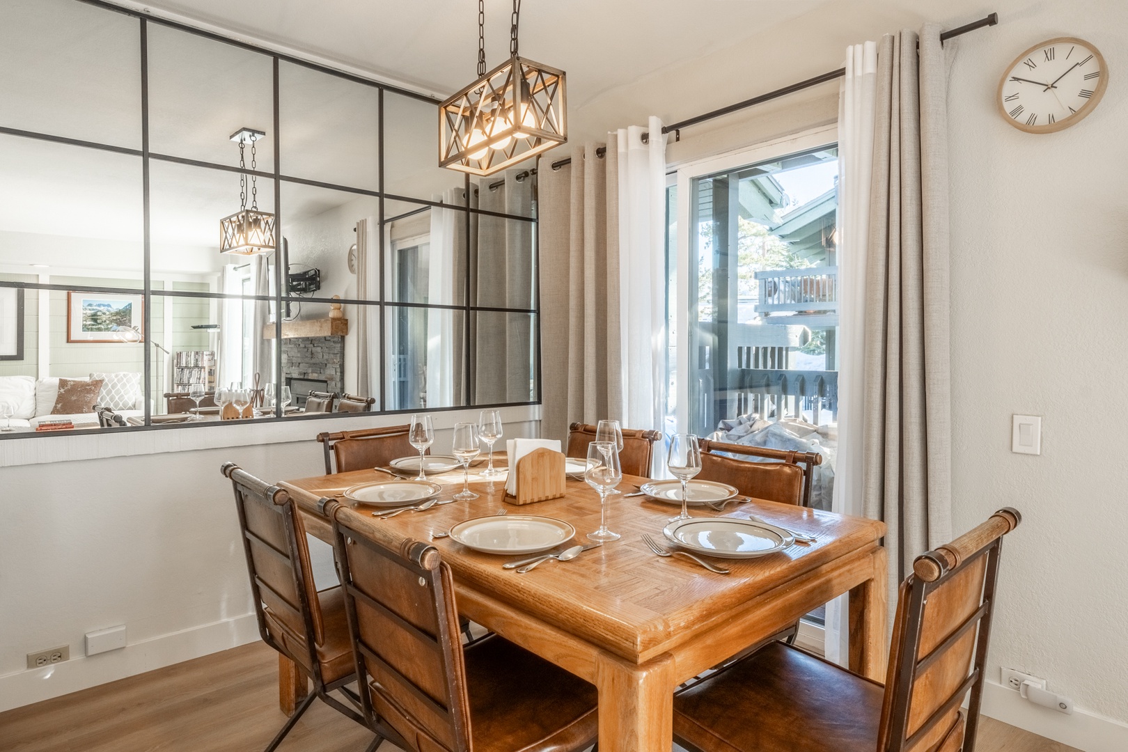 The kitchen features granite countertops, ample cabinetry, and a practical layout that makes cooking and meal prep easy during your stay. An adjacent dining area includes a dining table with comfortable seating, offering a welcoming place to gather for meals, morning coffee, or an easy game night after a day on the mountain.