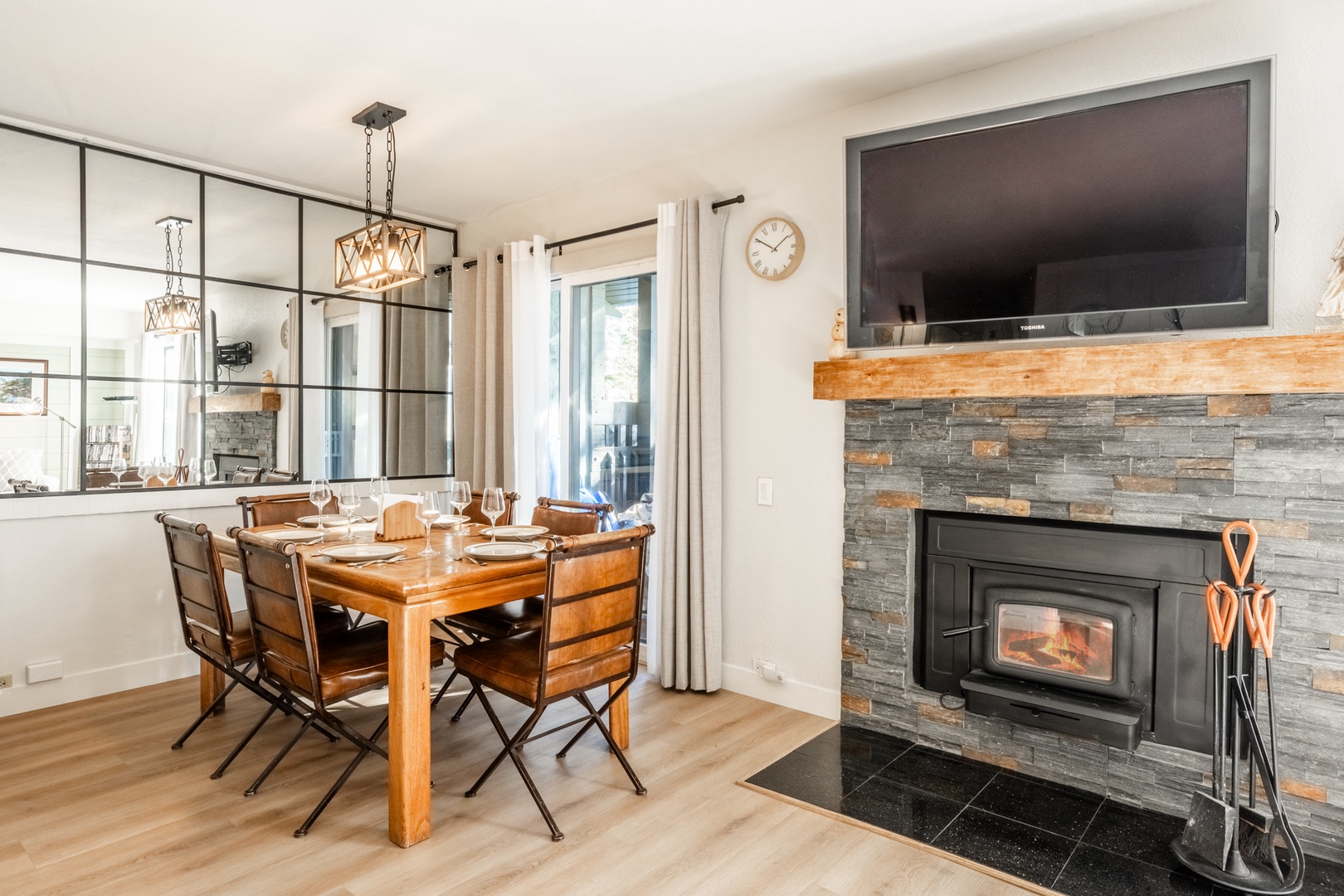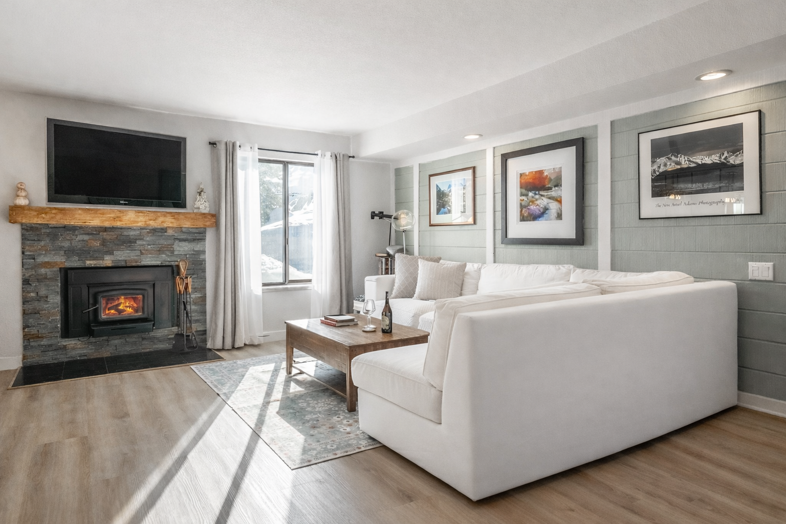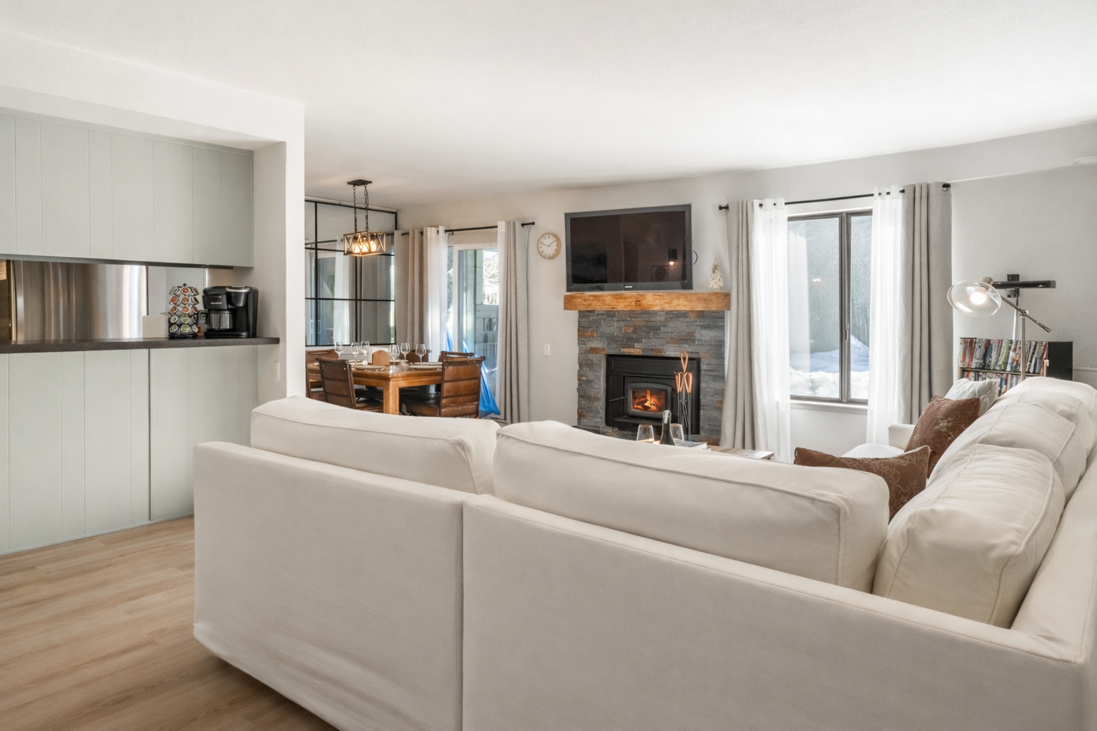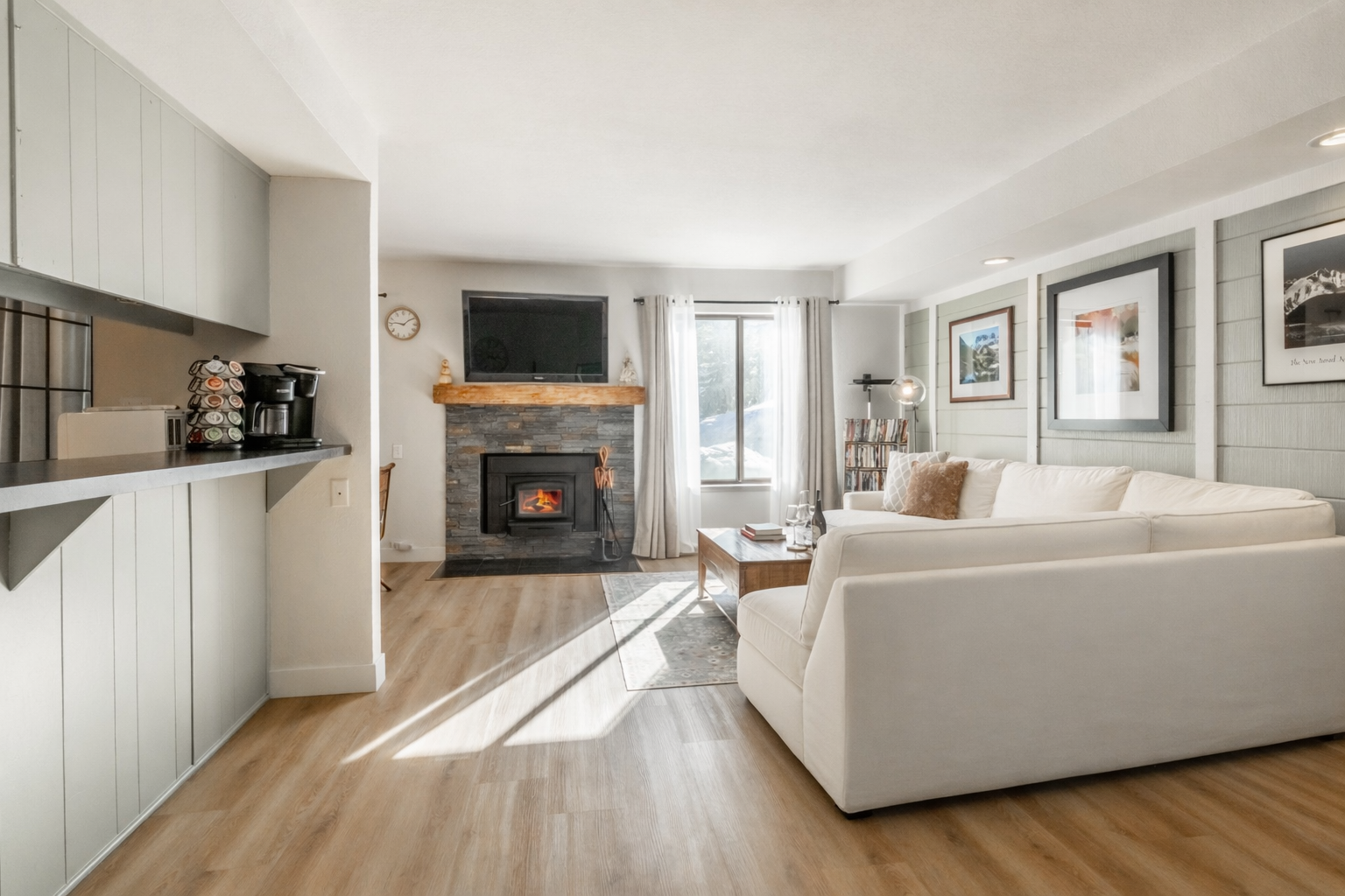 The interior opens to a bright, open living space anchored by a stone-faced wood-burning stove, creating a natural focal point for evenings after the slopes. Comfortable seating is arranged in a relaxed layout that makes it easy to unwind, watch TV, or enjoy a quiet night in. Windows along the living area bring in steady natural light throughout the day, creating a bright and welcoming space.